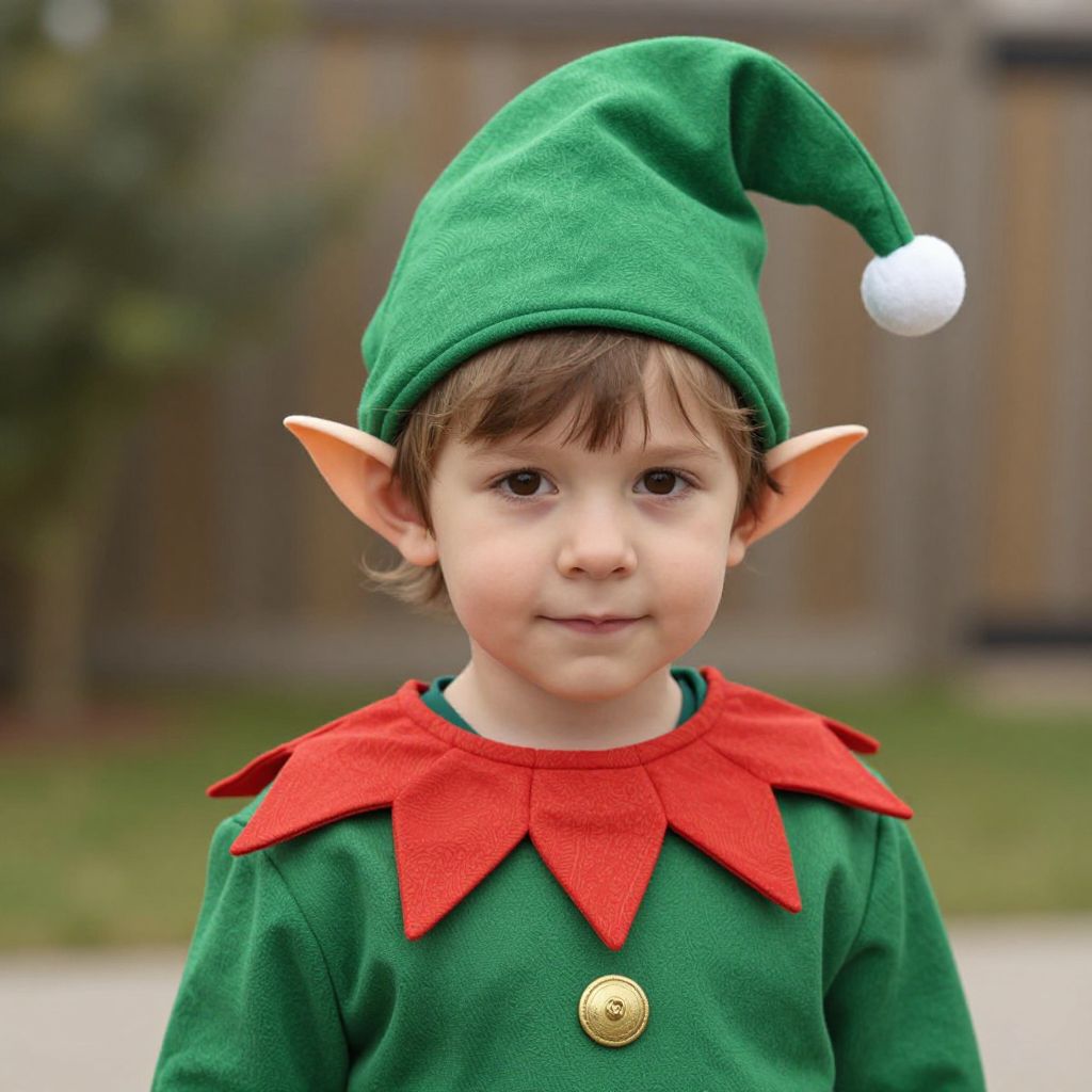 Makeshift Elf Costume, a close up of a child dressed in a costume and a hat