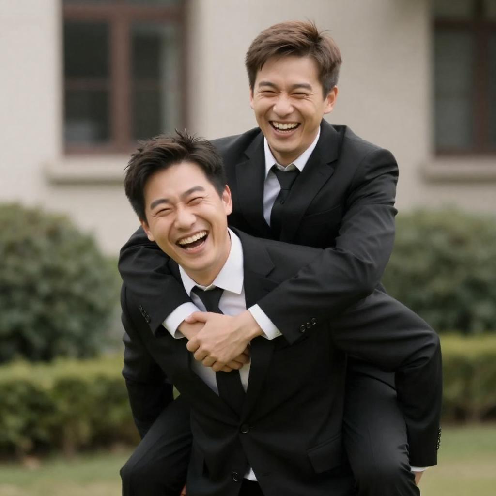 Photograph of two men in black suits laughing outdoors. The man in front has short dark hair and is being playfully grabbed by the shoulders by the man behind him, who has short brown hair. They are surrounded by greenery and a beige building with a window. The man in front has a wide, joyful smile.