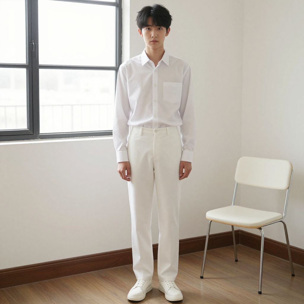 "cotton costume, 1boy, male focus, solo, indoors, pants, shirt, window, white shirt, standing, black hair, shoes, full body, long sleeves, collared shirt, chair, white footwear, closed mouth, looking at viewer Realistic photo of casual sexy person with pretty face"