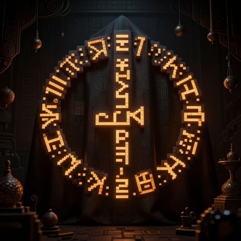 Pixel cloak embedded with ancient runes, glowing softly in a dimly lit room full of arcane artifacts, mystical ambiance with detailed pixel art style textures and shadows