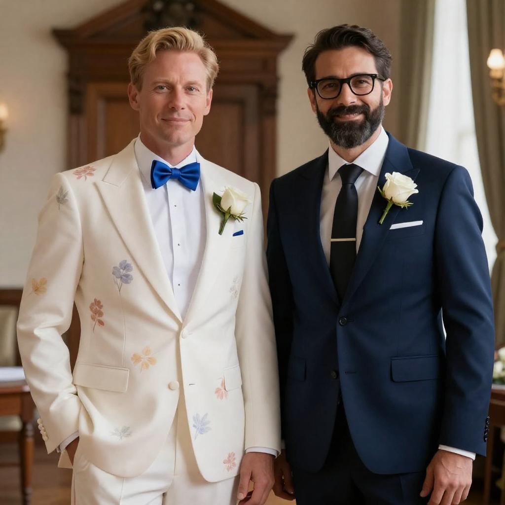 Photograph of two men in an airplane cabin. The man on the left, with blonde hair and a navy blue shirt, adjusts the collar of the man on the right, who has dark hair, a beard, and a plaid shirt. Overhead compartments and seatbacks are visible in the background.