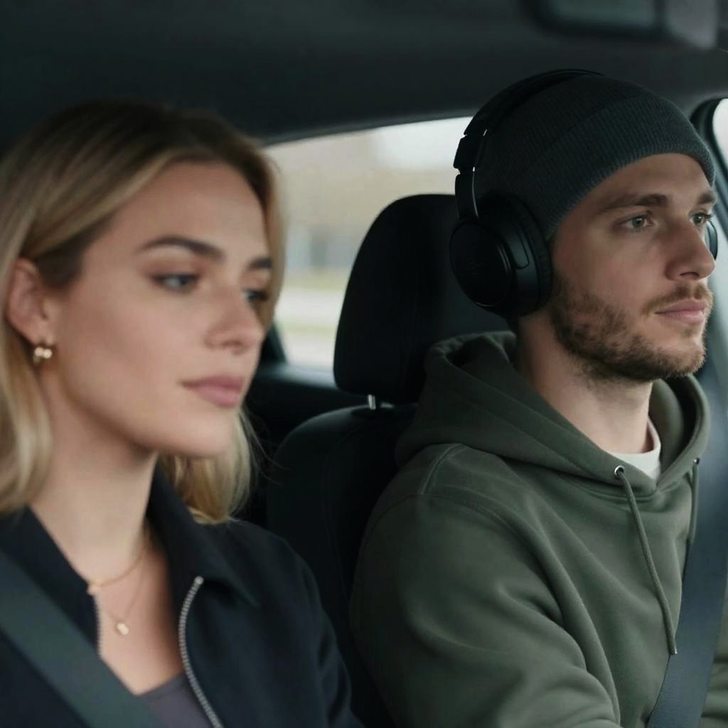 Photograph of two people in a car. Blonde woman with red lipstick in foreground, slightly out of focus, looking downward. Beige-haired man in background, wearing gray beanie, blue hoodie, black scarf, and headphones, looking forward. Both have neutral expressions. Blue car interior in background.