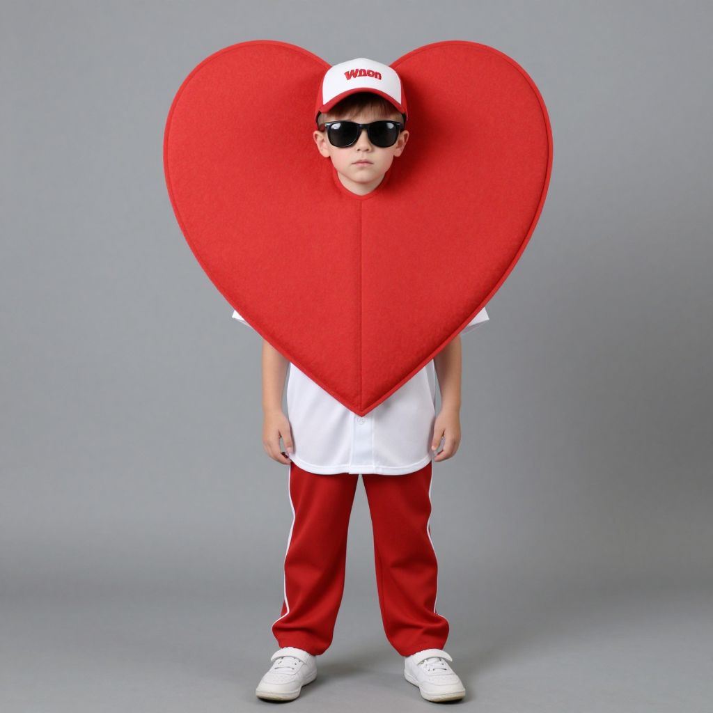 Heart costume, 1boy, male focus, heart, hat, solo, pants, parody, baseball cap, sunglasses, blurry, shirt