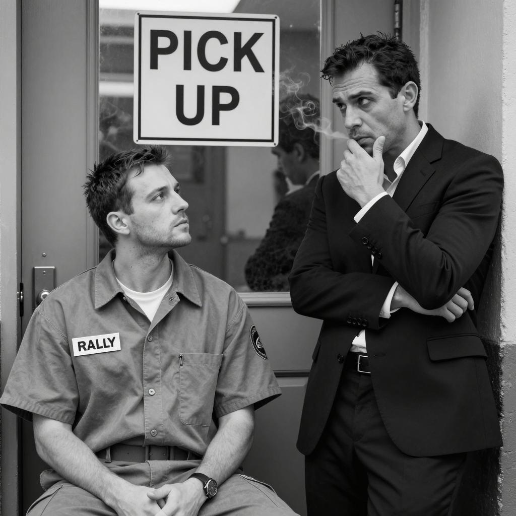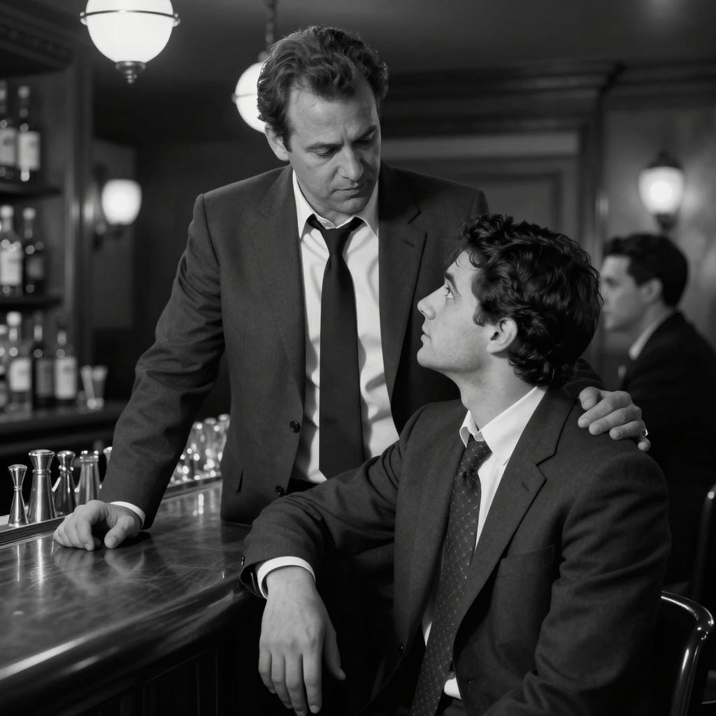 Black and white photograph. Two men in suits, one with short dark hair, the other with slightly darker hair. First man on left, head in hand, looking down, facial expression contemplative. Second man on right, looking up, intense expression. Both wear dark suits, white shirts, dark ties. Background: blurred brick wall, door. First man in front, second man slightly behind.