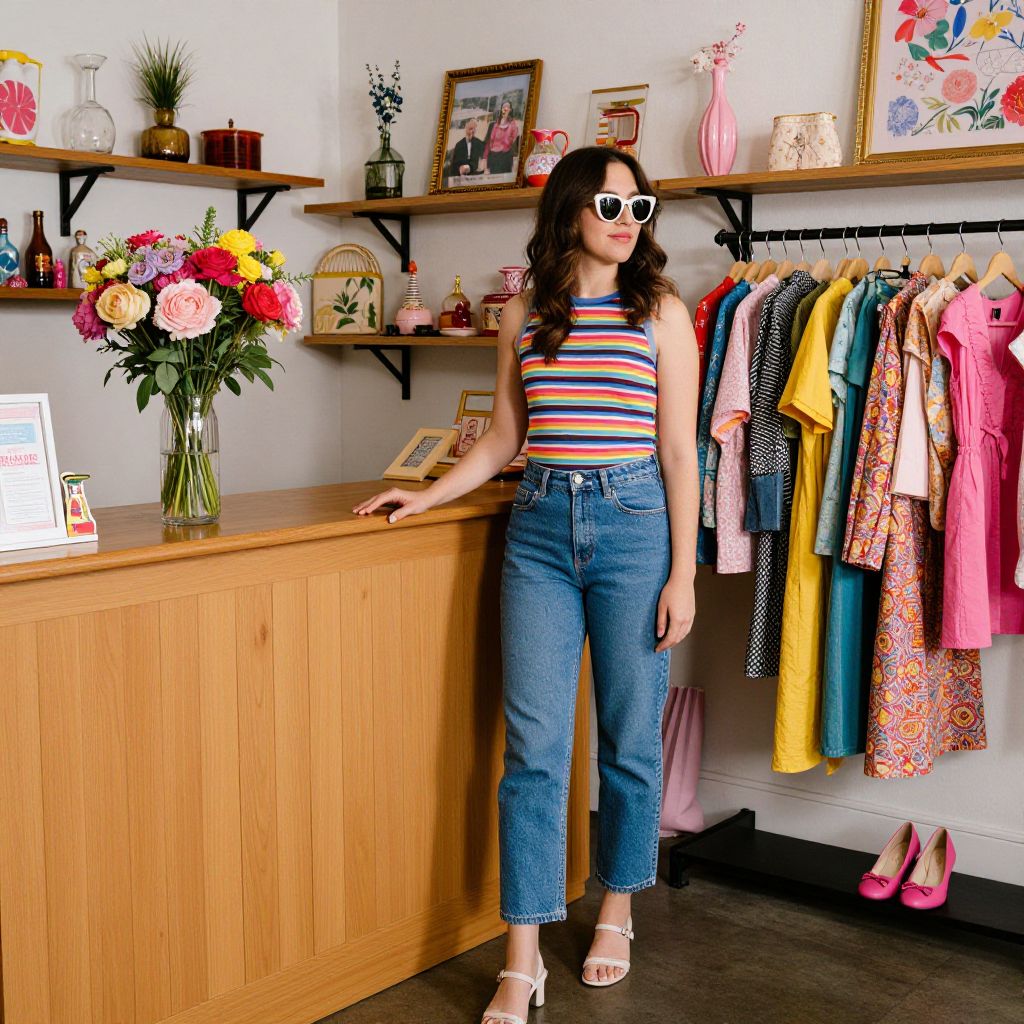 Photograph of a young woman with long, wavy dark brown hair and fair skin standing in a colorful, stylish boutique. She wears a striped, short-sleeve top with red, white, and blue stripes, and high-waisted blue jeans with a white belt. She is also wearing black sandals. The background features wooden shelves with decorative items, including a vase of vibrant flowers, framed pictures, and pink ceramic plates. To her right, a black clothing rack displays a variety of colorful dresses and tops. A wooden counter with a small white sign and a candle is in the foreground. The floor is concrete.