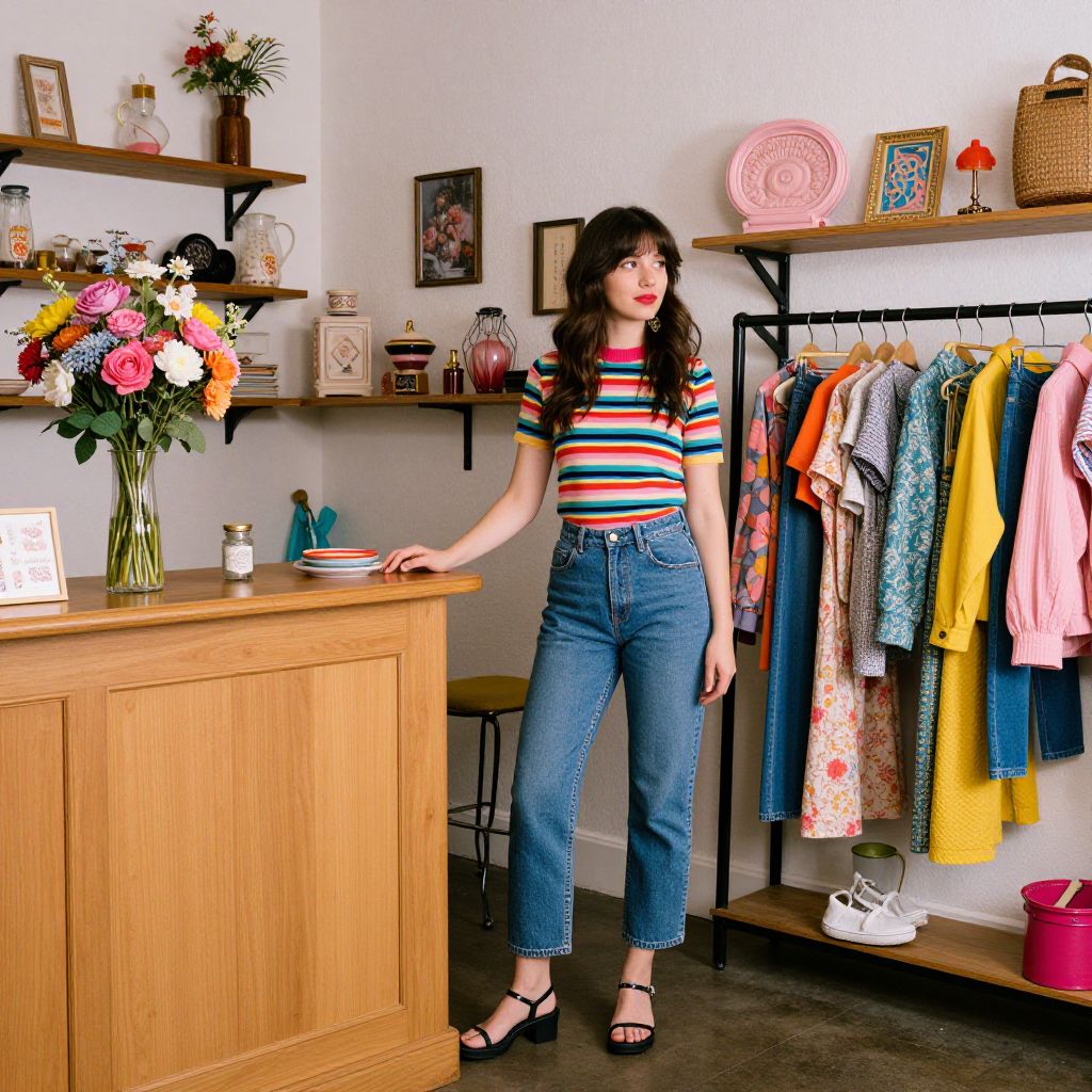 Vibrant vintage vibes unfold in this cozy interior, featuring a woman in a striped top and jeans standing beside a wooden counter adorned with a floral arrangement, while shelves filled with eclectic items and a rack of colorful clothing create a charming backdrop.