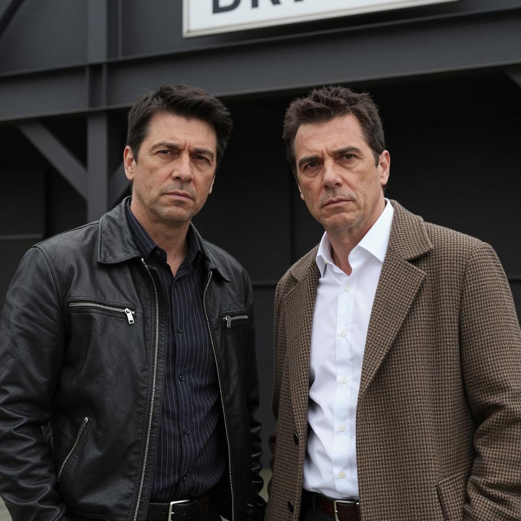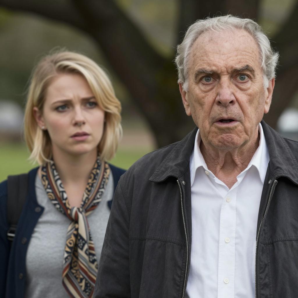 Three people stand in a cemetery. Blonde woman in blue coat with buttoned collar, striped blouse, hands in pockets. Dark-haired man in black pinstripe shirt, arms crossed. Gray-haired man in dark suit, white shirt, black tie. Grave markers and trees in background. Woman's expression is serious, men's expressions are neutral.