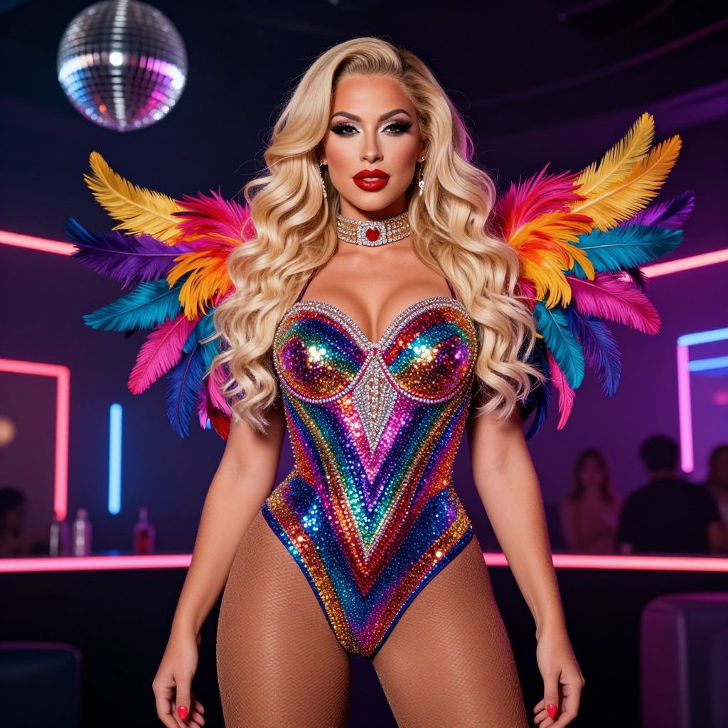 Photograph of a glamorous woman with long, wavy blonde hair and red lipstick. She's wearing a sparkly, multicolored bodysuit with a heart-shaped chest piece, colorful feathered shoulder wings, and a choker. Her skin is tan, and she's standing in a vibrant, neon-lit club with a hanging disco ball. Her confident pose and bold makeup make her look fierce and captivating.