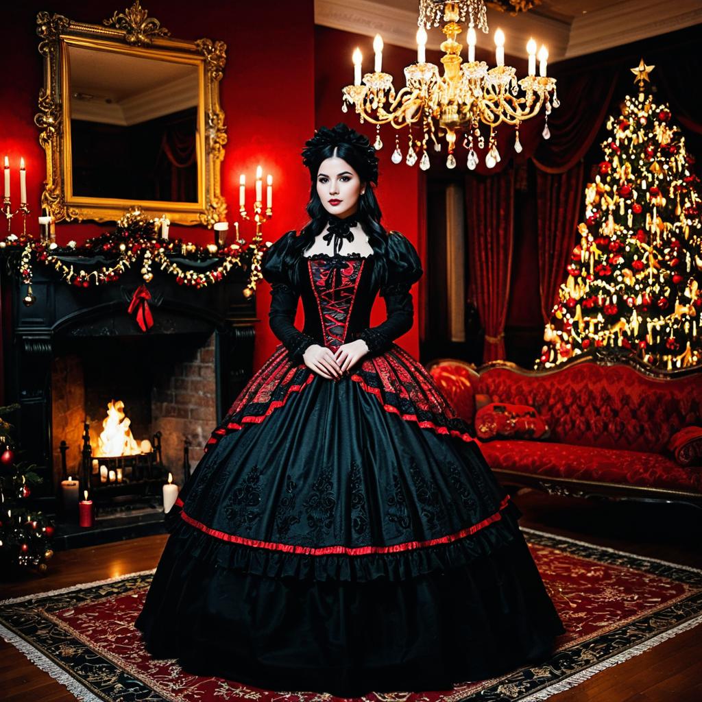 Goth christmas outfit, gothic lolita, Christmas, photograph, dark-haired girl, red and black Victorian dress, floral embroidery, Christmas tree, red and gold ornaments, candles, chandelier, ornate fireplace, warm lighting, realistic, detailed, holiday, vintage, elegant, intricate patterns, soft light, full-body shot, subtle makeup, red lipstick