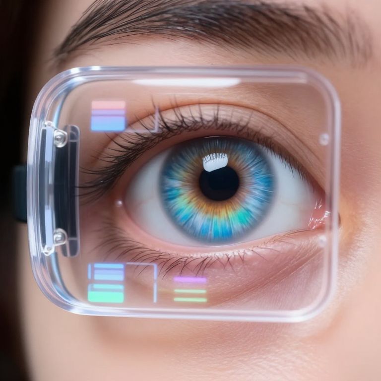 What is my eye color scanner gadget close-up on a person's eye, scanning process showing colorful iris analysis, sleek transparent scanner with holographic display, scientific and tech vibe, photorealistic style
