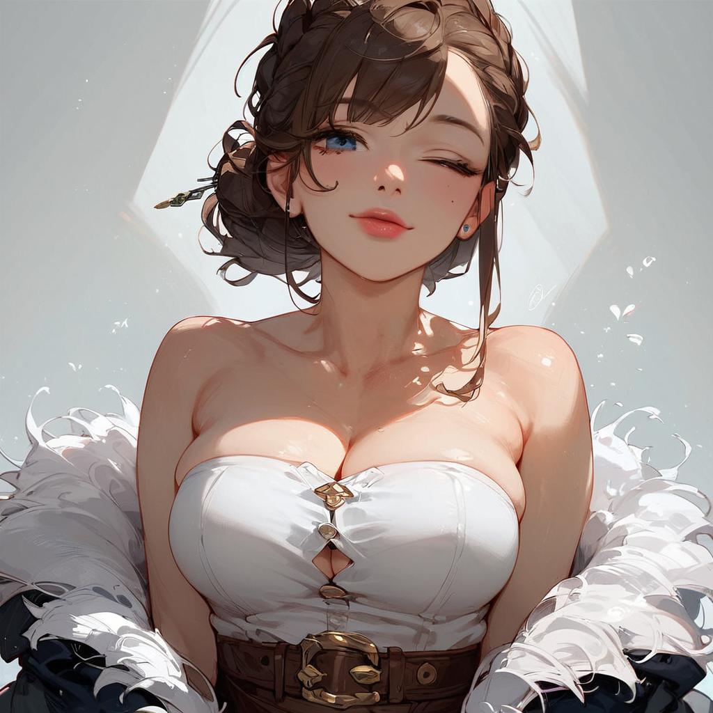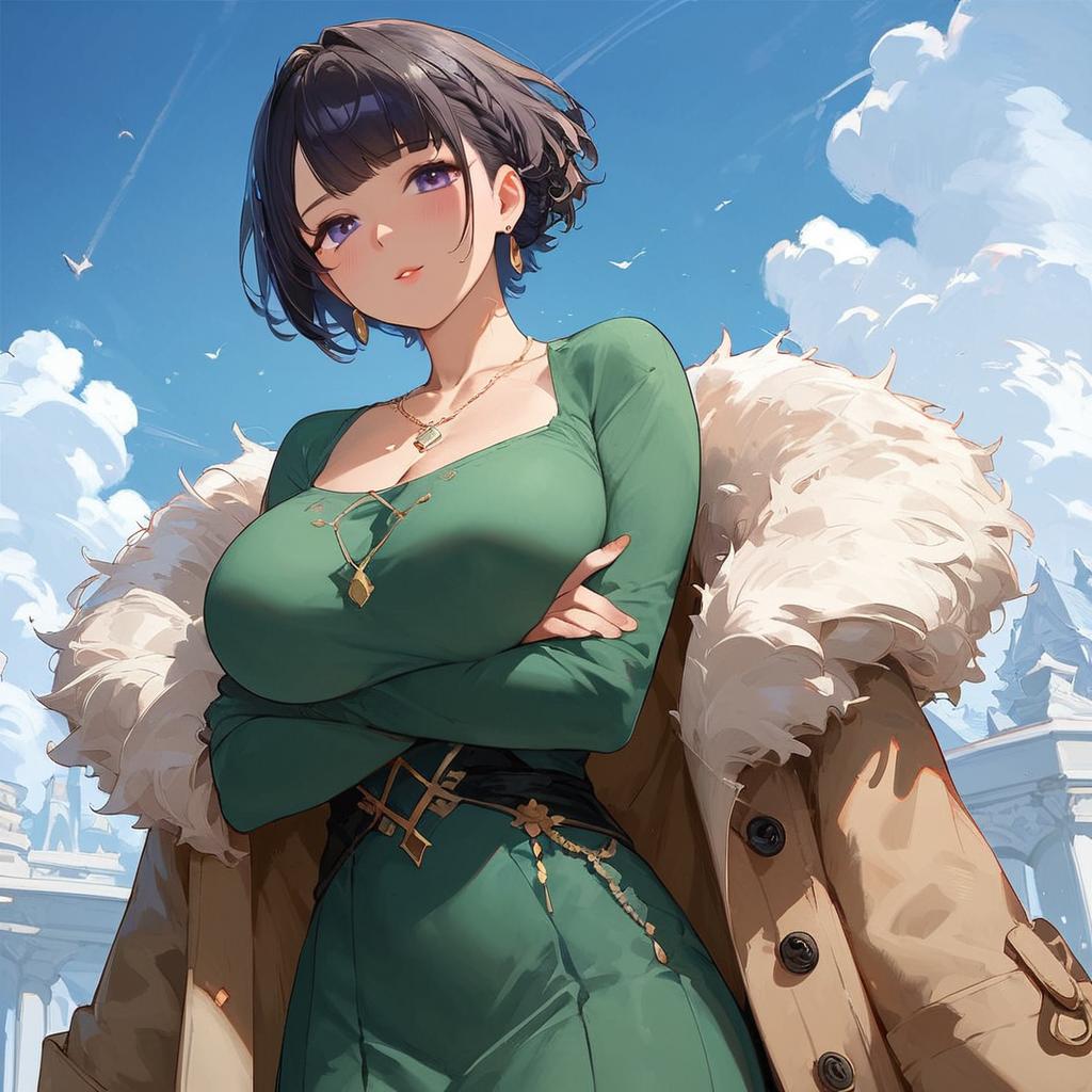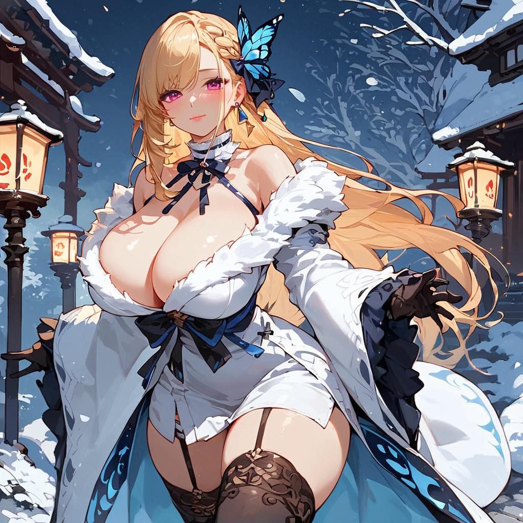 Score_9, score_8_up, score_7_up, score_6_up, source_anime, 1girl, blonde hair, hair over one eye, green jumpsuit, open jumpsuit, navel, cleavage, belt, green pants, fingerless gloves, large breasts, snow, upper body, looking at you, winter, tundra, expressionless