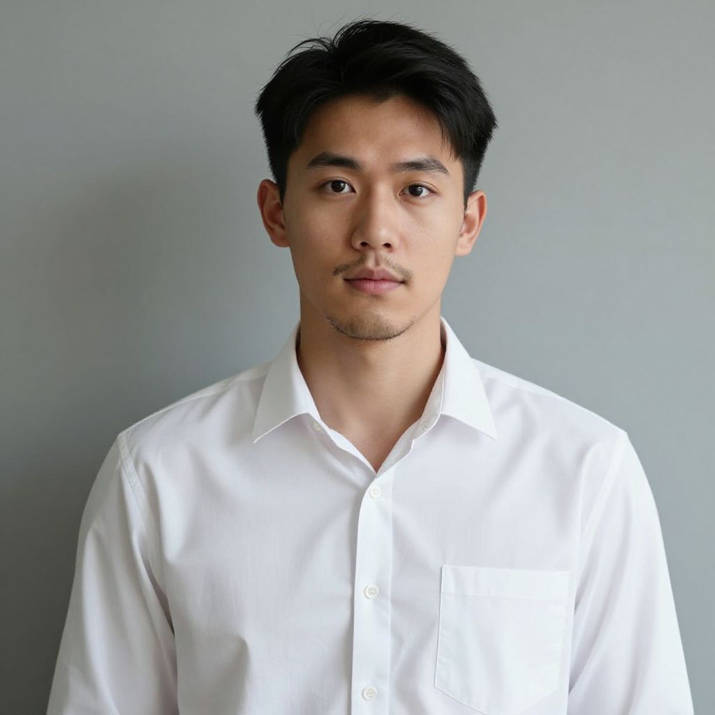 Photograph of an Asian man in a black suit, white shirt, and black tie, standing against a plain white wall, hands in pockets, with
