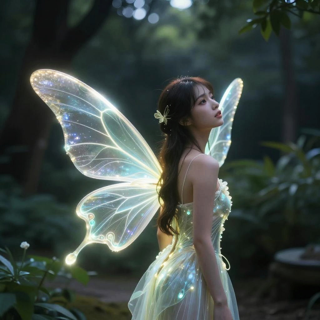 Realistic photo.Glowing fairy, delicate luminescent wings, serene garden at twilight, cinematic, ultra-high definition, depth of field, 8K. realistic photo