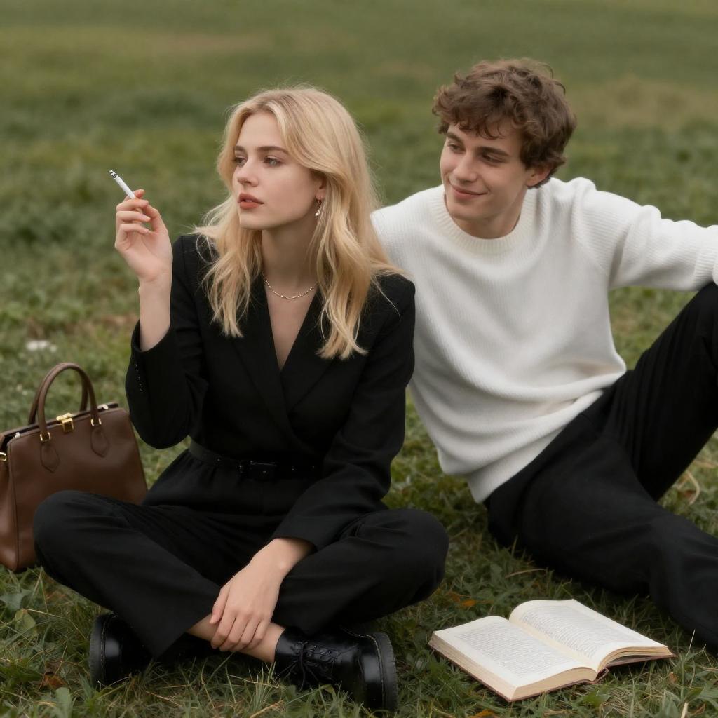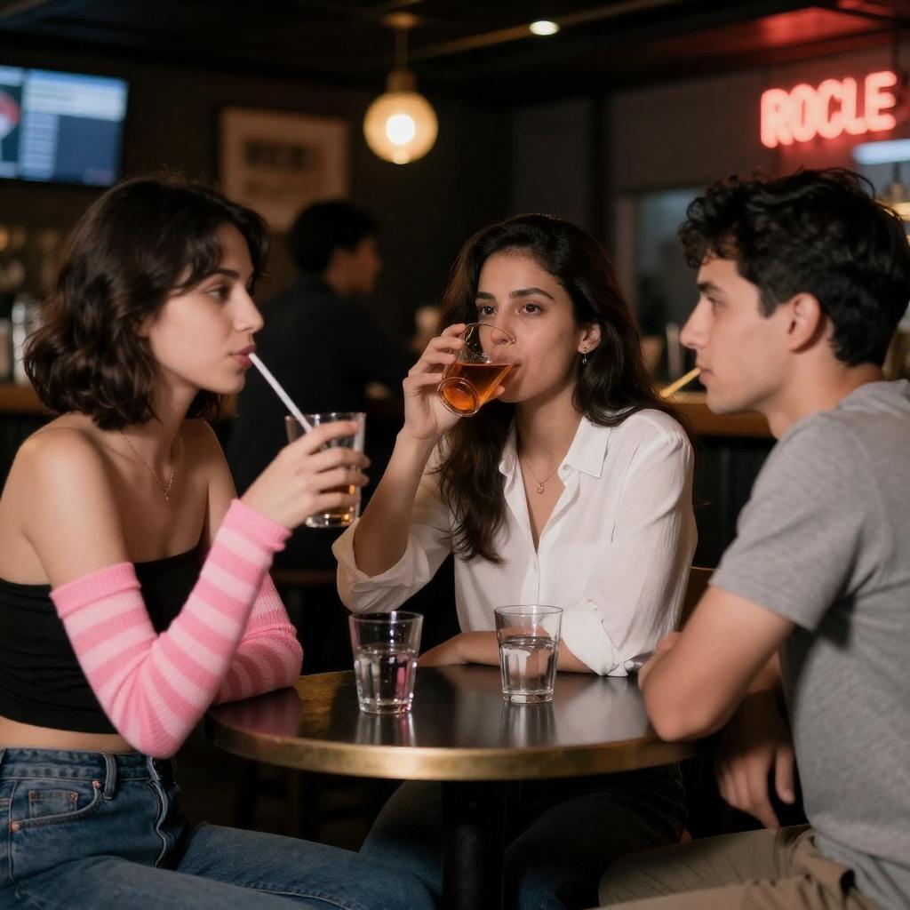 Photograph of a blonde woman in an orange shirt with a white checkered collar, holding a drink, standing beside a bearded man with dark curly hair, smoking, wearing a blue shirt. They are in a dimly lit bar with warm, yellow lights in the background.