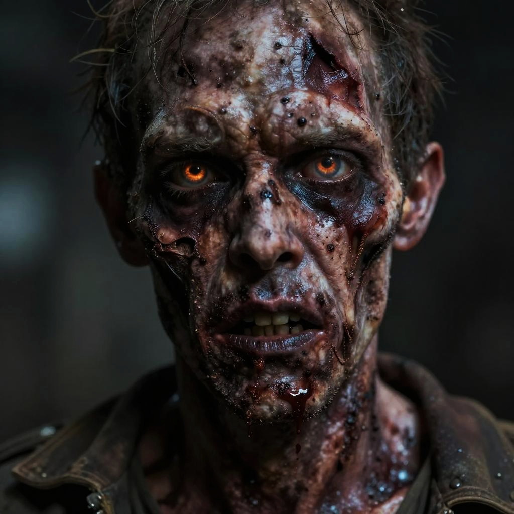 A highly detailed, dark, and eerie photograph of a male zombie with a grimy, blood-stained face. His skin is covered in grime, blood, and dirt, with a mix of black and red hues. His eyes are a glowing, unsettling orange, contrasting sharply with his dark, decaying complexion. His mouth is slightly open, revealing a row of yellowed, decayed teeth. He has short, disheveled dark hair. He wears a tattered, brown jacket. The background is a blurred, dark gradient, emphasizing the zombie's grotesque appearance. The image has a dramatic, high-contrast style, highlighting the horror and decay.