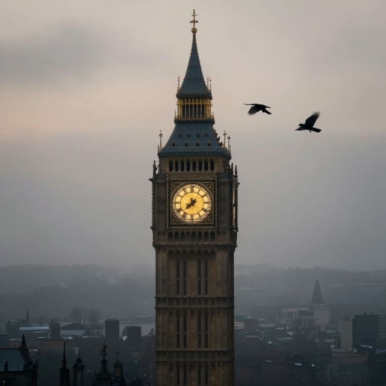 Amidst a hushed valley shrouded in mist, a clock tower ascends, its face illuminated by a golden glow as crows swirl around it like whispers of forgotten time, evoking a haunting blend of serenity and existential mystery.