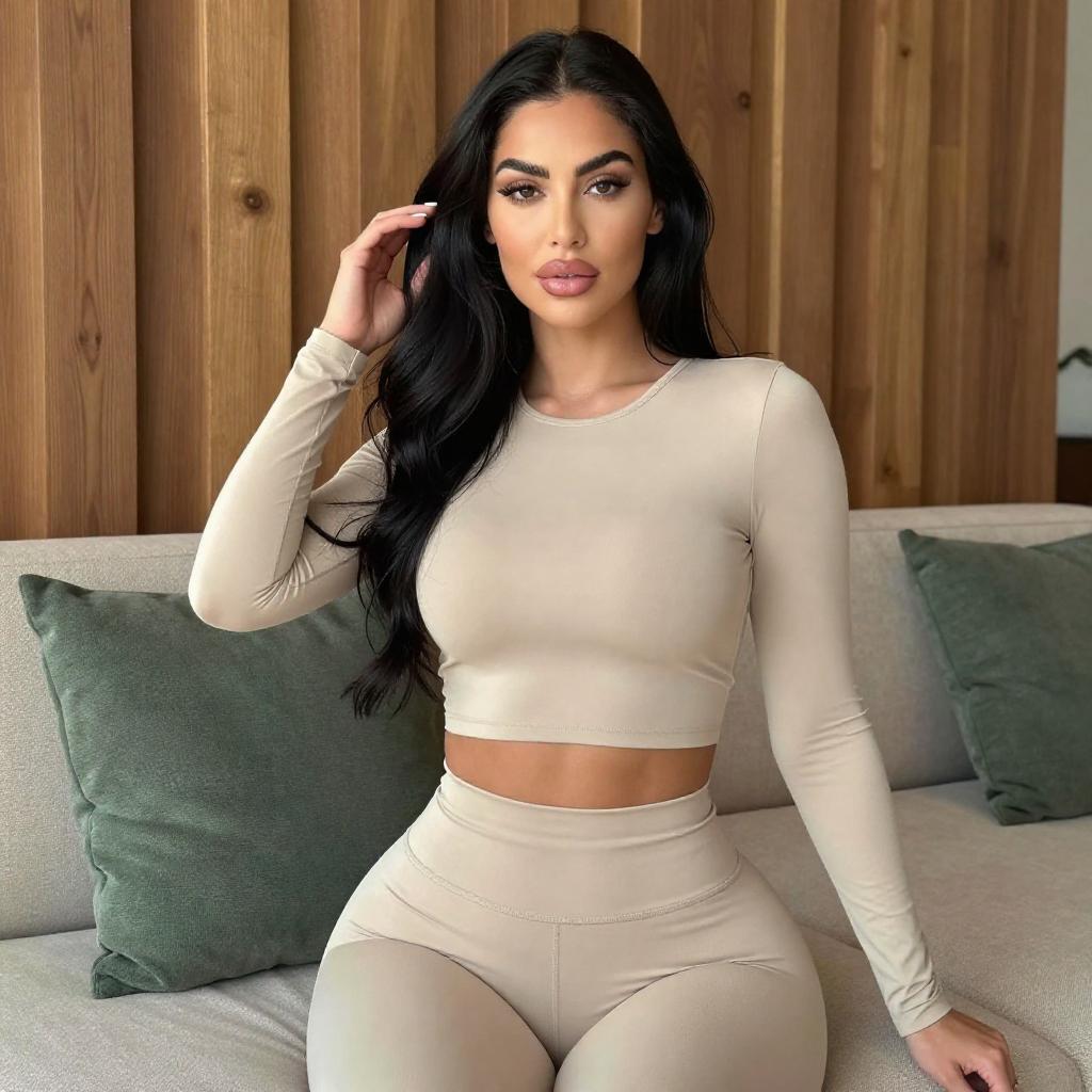Photograph of a young woman with long, wavy black hair, light olive skin, and full lips. She wears a green, long-sleeve crop top and tight black pants, highlighting her curvy figure. She holds a green and white patterned clutch and stands in a luxurious, marble-lined hallway with tall windows and white columns.