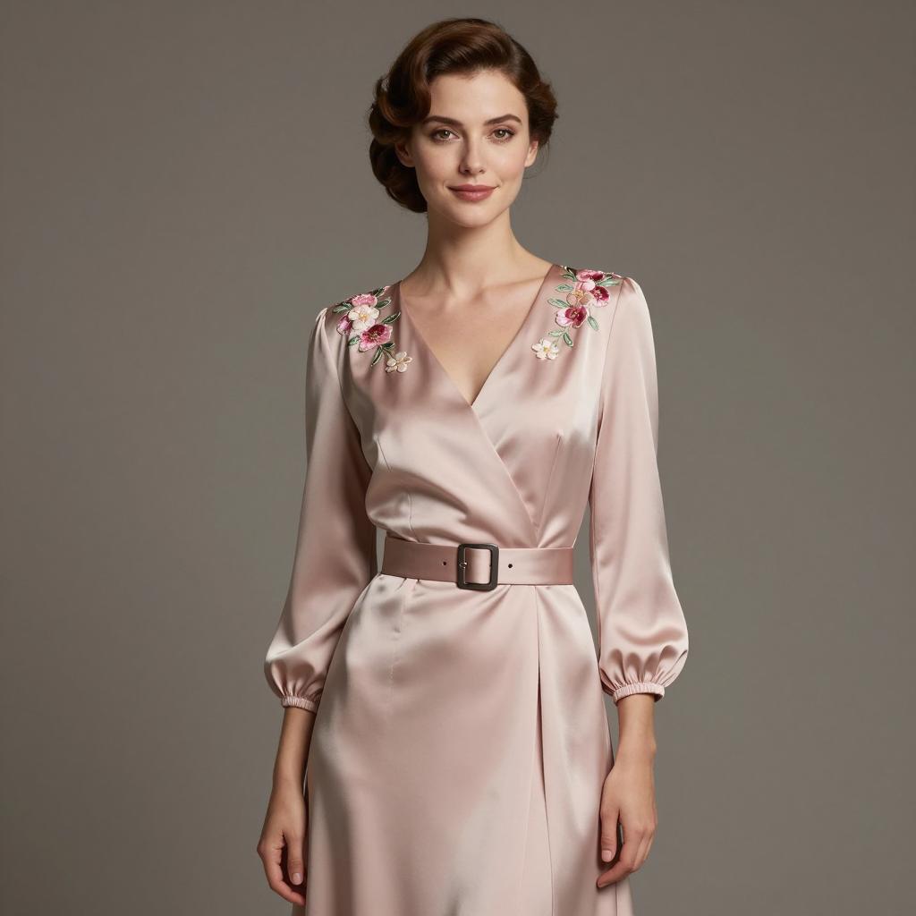 Retro party theme dress, photograph of a woman, 1940s style, vintage fashion, brunette, wavy hair, red lipstick, pearl necklace, patterned dress, beige long sleeves, floral wall decor, orange and yellow paper flowers, green plants, indoor setting, warm lighting, centered, smiling, realistic, detailed, daytime, medium shot, elegant, retro, feminine, soft focus background