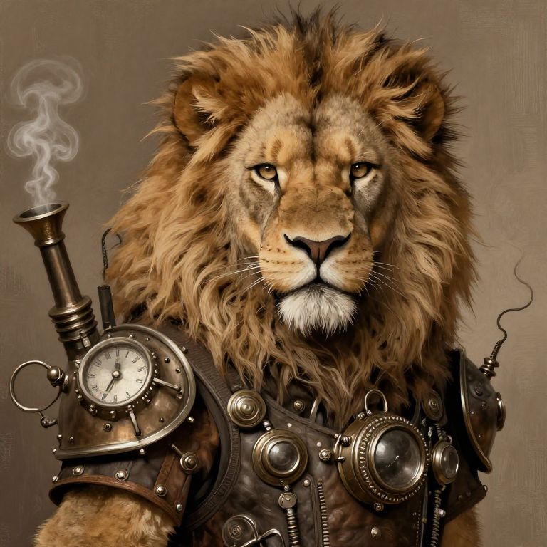 Digital artwork of a regal lion wearing steampunk armor with gears, a clock, and a smoking pipe, set against a brown gradient background.