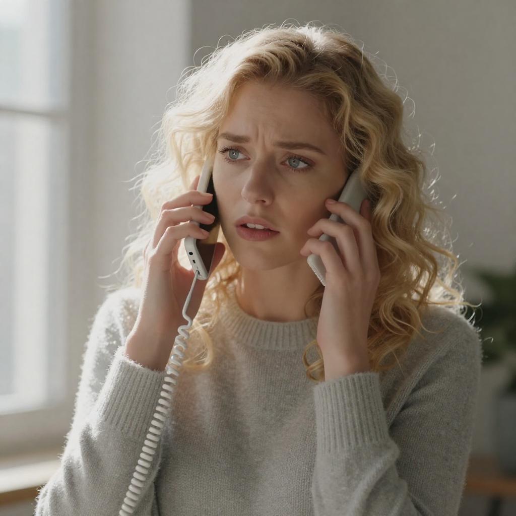 A dark, moody photograph of a young woman with pale skin and short brown hair lying in bed, partially covered by blue-gray blankets. She holds a phone to her ear with a concerned expression, illuminated by dim, blue lighting. Her eyes are wide and focused. The background is shadowy and indistinct.