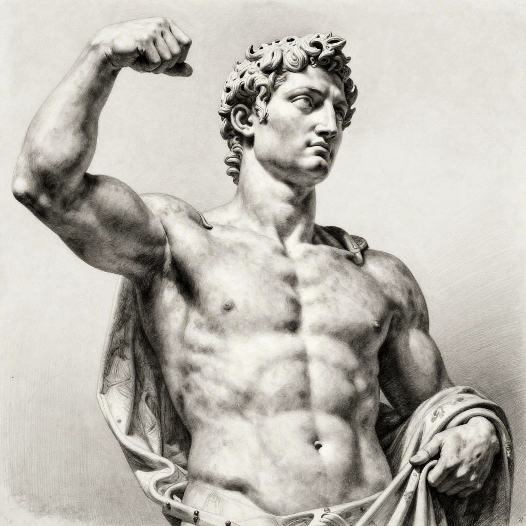 Realistic photo.Classical pencil drawing by Michelangelo Buonarroti depicting a powerful ruler, with strong contrast, dignified demeanor, and assertive poses, in authoritative and commanding, iconic and masterful realistic photo