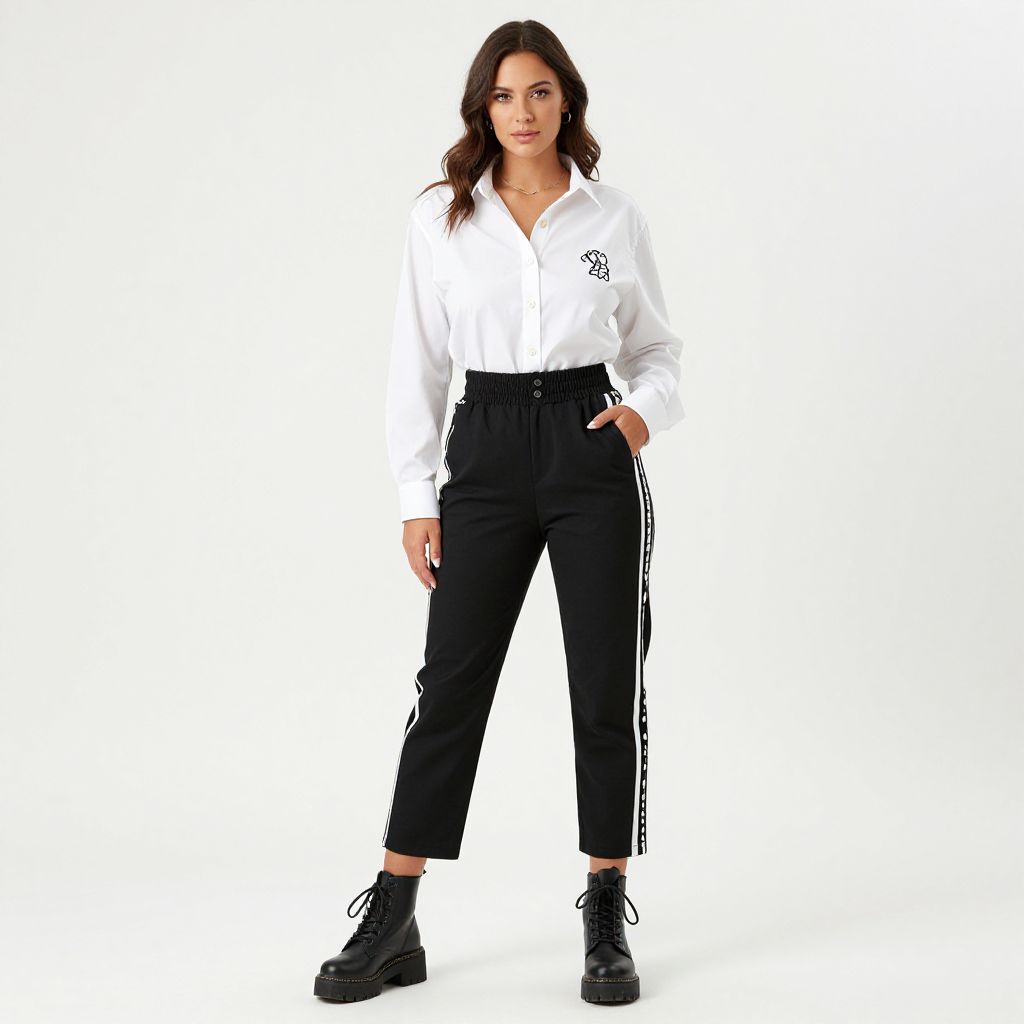 "Woman, casual contemporary, white button-up shirt, relaxed fit, embroidered left breast logo, black high-waisted pants with dual pattern, vertical stripes on one half, polka dots on the other, cropped at the ankle, chunky black lace-up boots, one hand in pocket posed, plain white background. Sexy. Pretty face and beаutiful eyes. Big breasts."