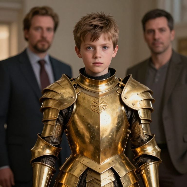 Photograph of a young boy with fiery helmet and suit, standing defiantly in front of burning building, fist raised, intense expression.