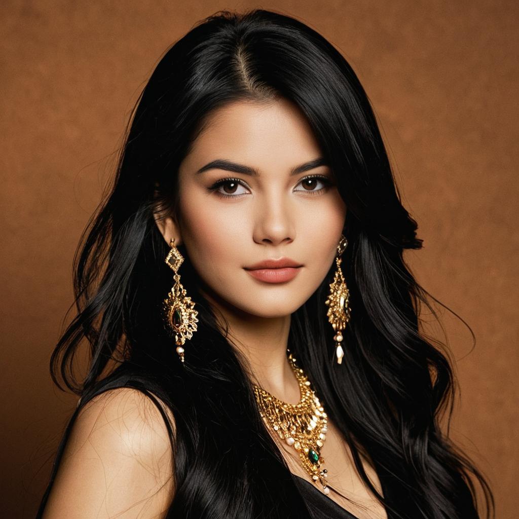 Portrait of a young Asian woman with long black hair and sparkling earrings holding a microphone. She is wearing a sleeveless black top and smiling against a simple grey background.