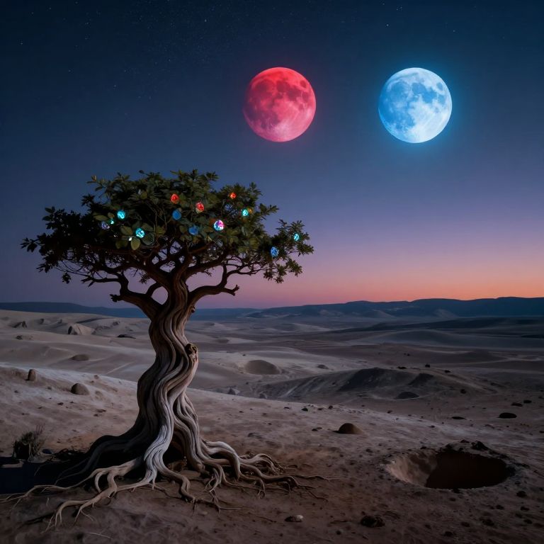 A surreal desert landscape at twilight featuring a twisted tree with colorful glowing orbs, under a starry sky with a red and blue full moon. Digital art