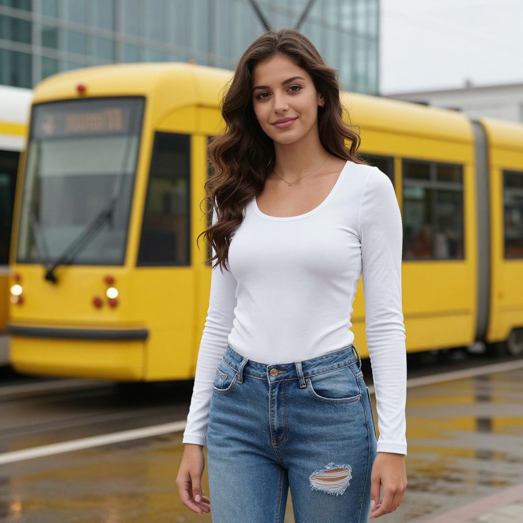 Photograph of a young woman with long, wavy brown hair, standing in front of a bright yellow tram. She's wearing a white, long-sleeve, fitted top and distressed blue jeans with a large tear on the right thigh. Her skin is lightly tanned, and she's smiling slightly with a relaxed, confident expression. The background includes a modern, glass building and a slightly overcast sky. The ground is wet, reflecting the tram and building.