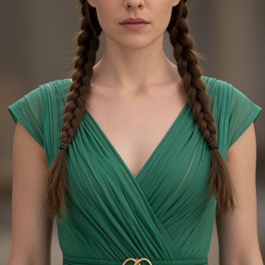 "Thena Eternals, a close up of a woman in a green dress with braids"