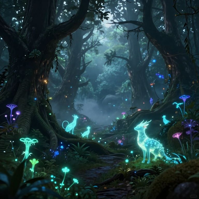 Mip fantasy forest scene, bioluminescent plants and mystical creatures glowing softly in the dark, ethereal mist circling ancient trees, magical atmosphere with a blend of natural and sci-fi elements, soft lighting emphasizing the enchanting environment.