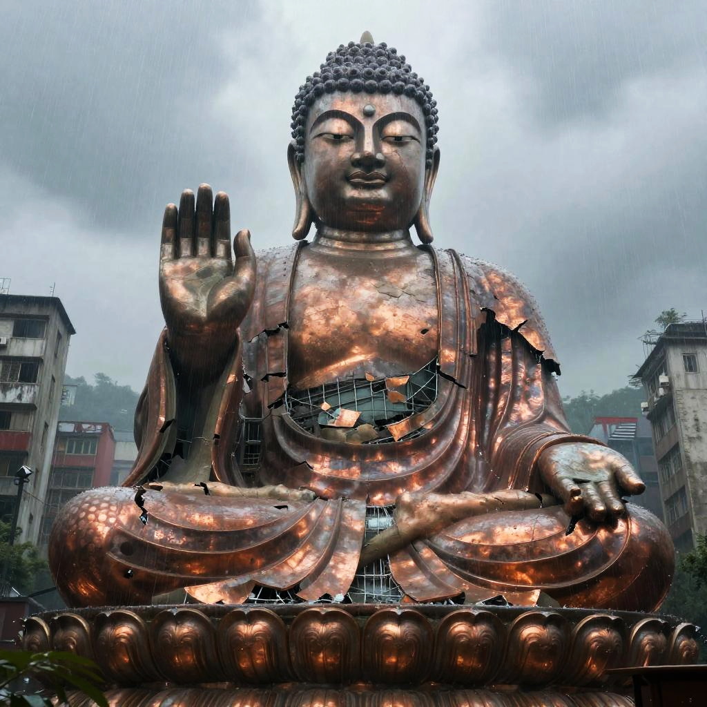 Giant Broken Copper Buddha Statue in Rainy Urban Setting