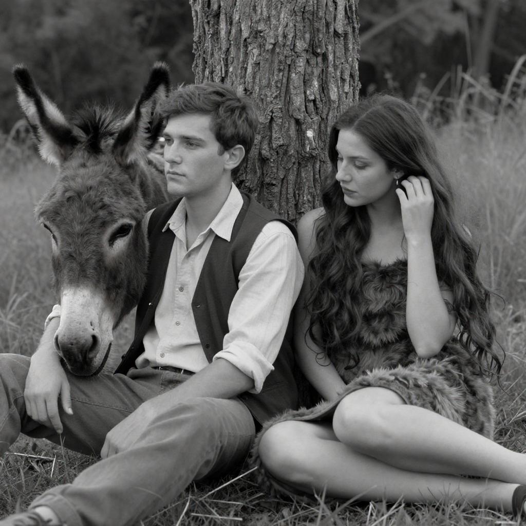 Black-and-white photograph of a man with a donkey head sitting next to a woman with long, flowing hair wearing a fur-like dress. They sit on grass by a tree. The man wears a vest and shirt, looking slightly to the left. The woman looks down, touching her hair. The man has a neutral expression. Forest background with tall grass. Both seated closely.