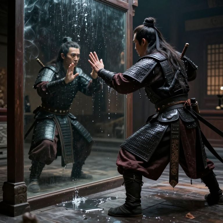An ancient warrior battles a mirror's reflection across centuries, his sweat melting into liquid time that drips and pools on the floor.