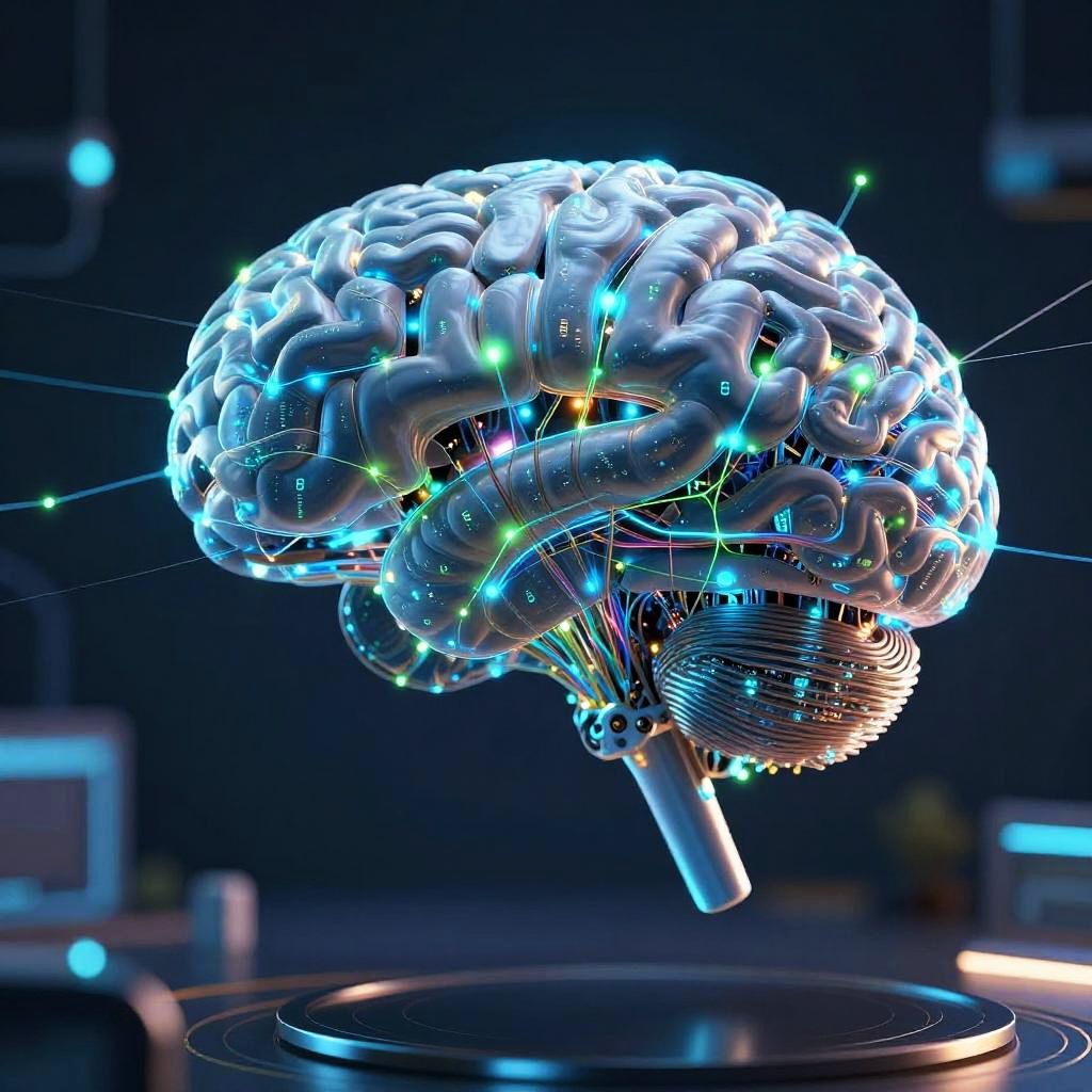 CGI image of a glowing, futuristic, white brain with colorful, neon lights interconnected, floating above a black, circular platform.