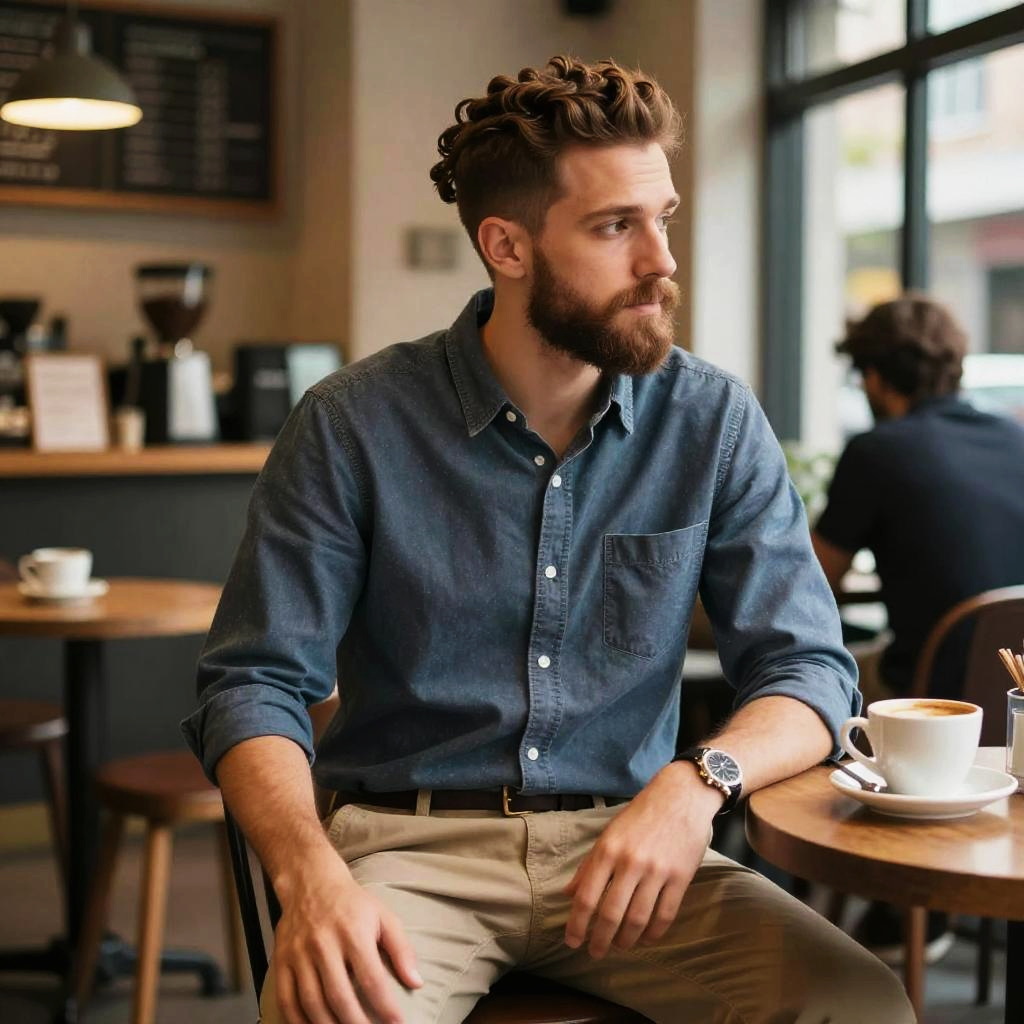 Mini Twists hairstyle on man with beard, wearing casual button-down shirt and chinos, in cozy coffee shop, captured in fashion editorial style with warm diffused cafe light.
