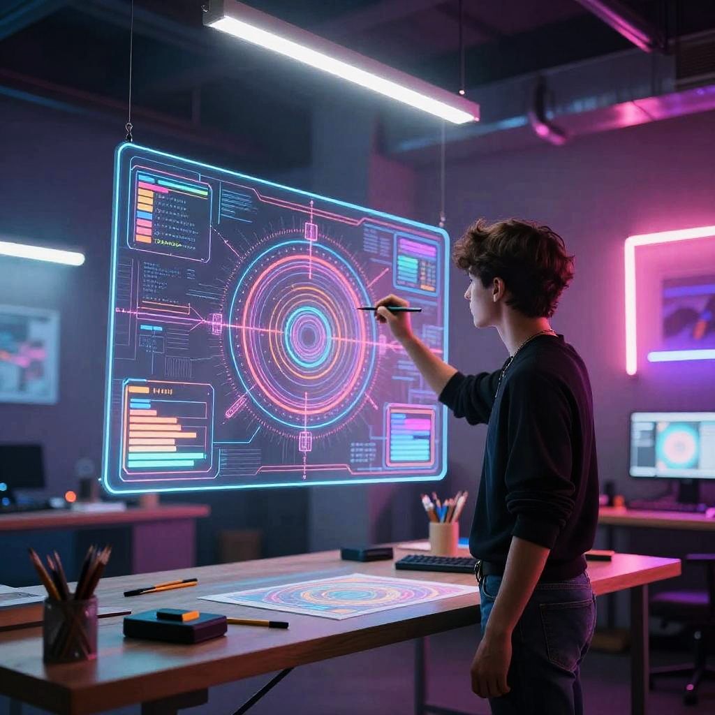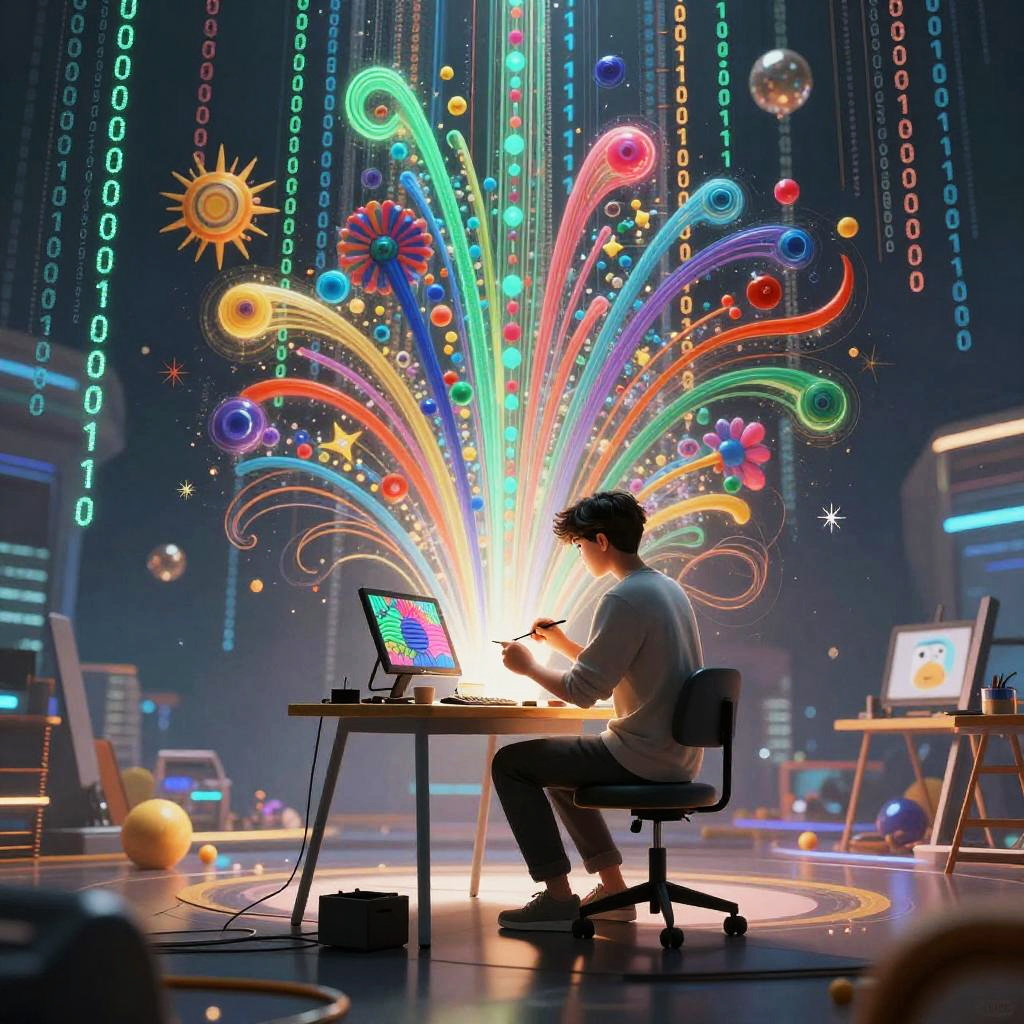 Free AI that generates images, a conceptual illustration of a digital painter AI producing limitless creative visuals, surrounded by swirling streams of binary code and colorful digital art forms, a futuristic environment with a creative and innovative vibe, ultra detailed.