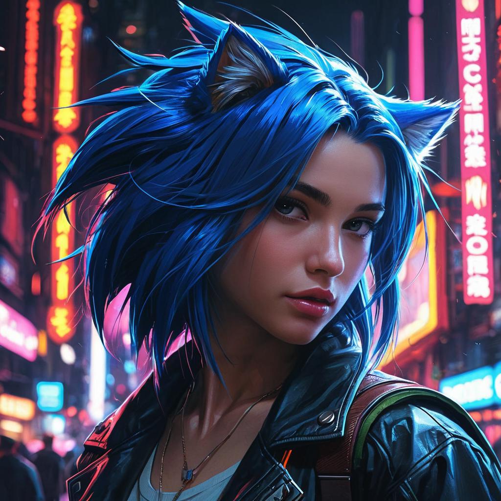 Digital anime-style portrait of a young female police officer with short blue hair and detailed facial features, wearing a police uniform and cap. The image features cyberpunk futuristic neon lighting with a reflective sheen on her puffy jacket. The background includes blurred police signage, creating a night-time urban atmosphere.