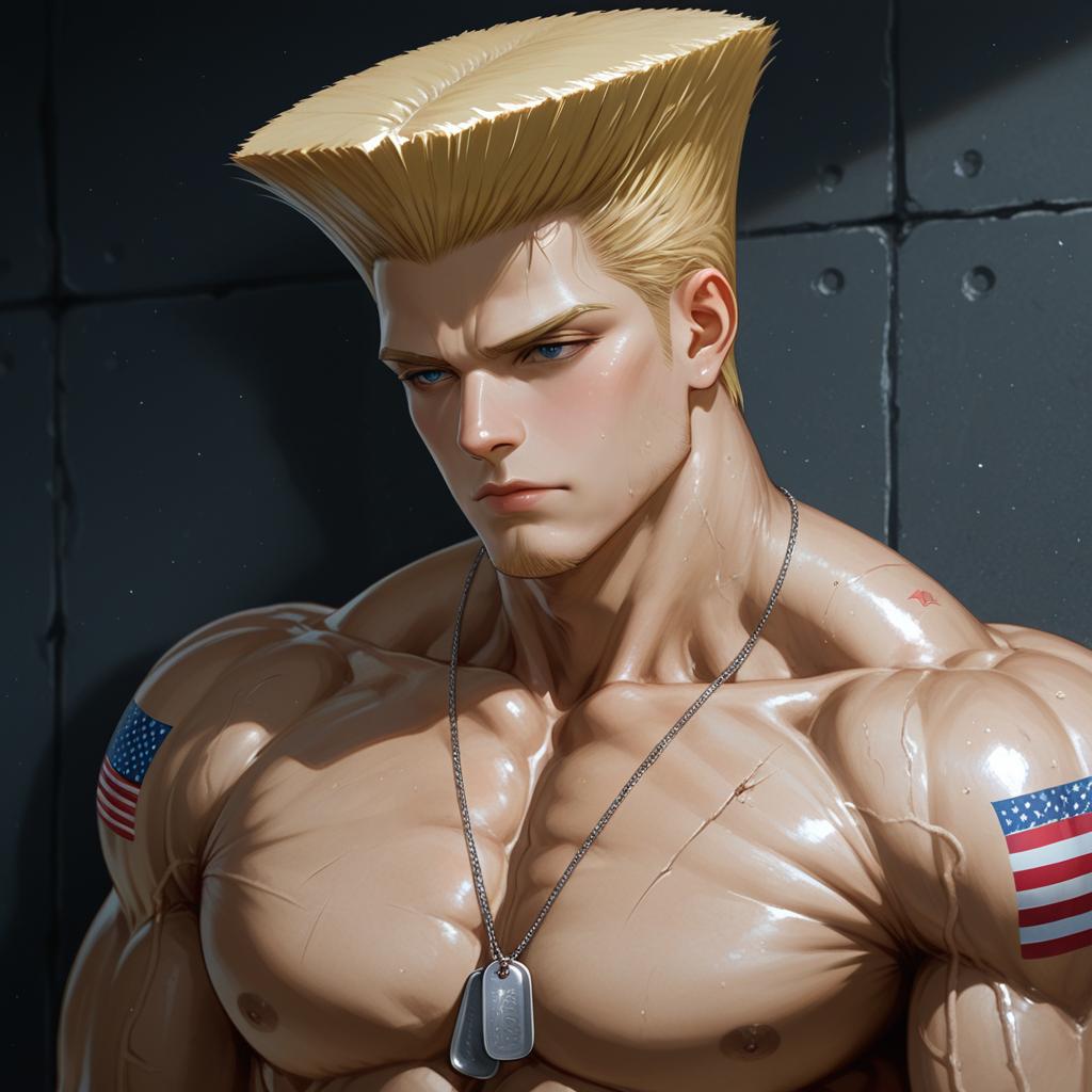 Guile, street fighter, 1boy, blue eyes, blonde hair, short hair, american flag tattoo, tattoo, muscular male, flattop, dog tags, by artist gulp5959, dark_illustrious