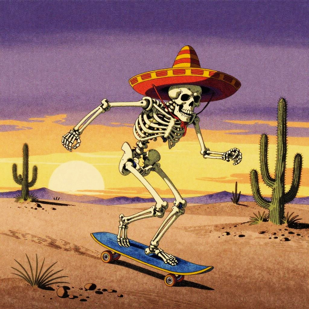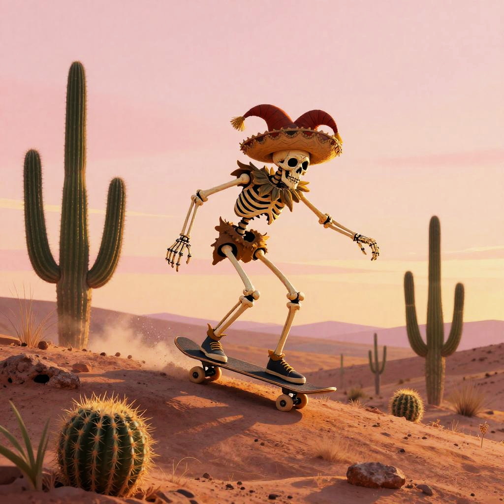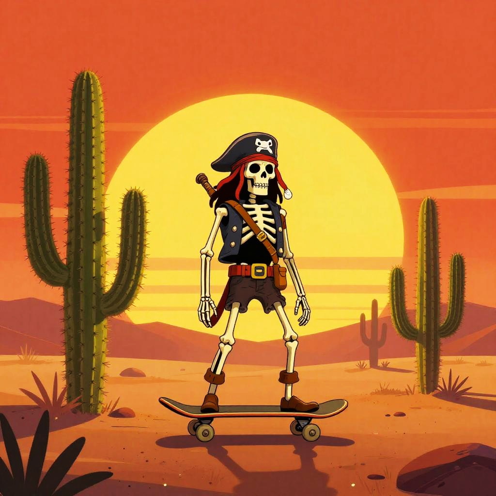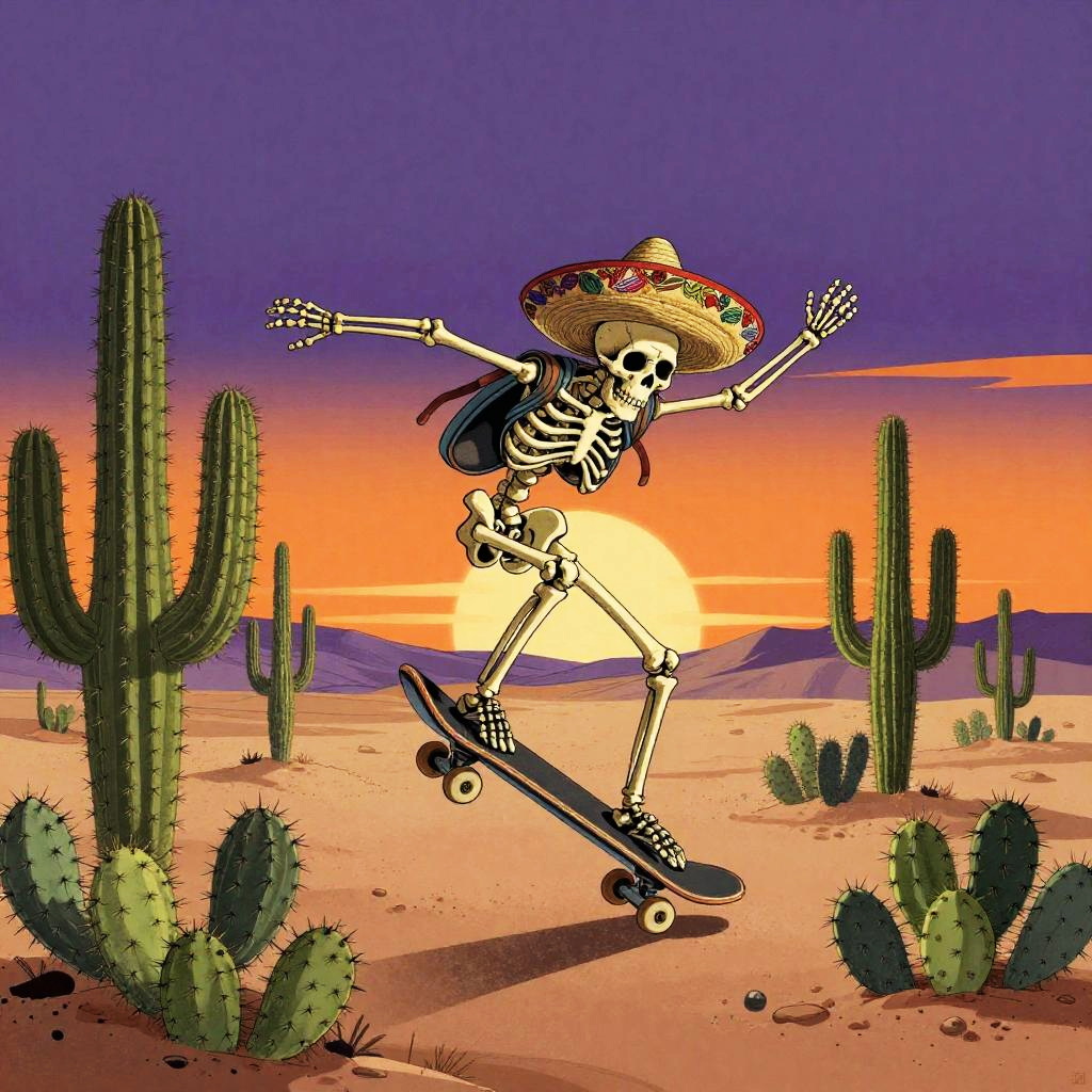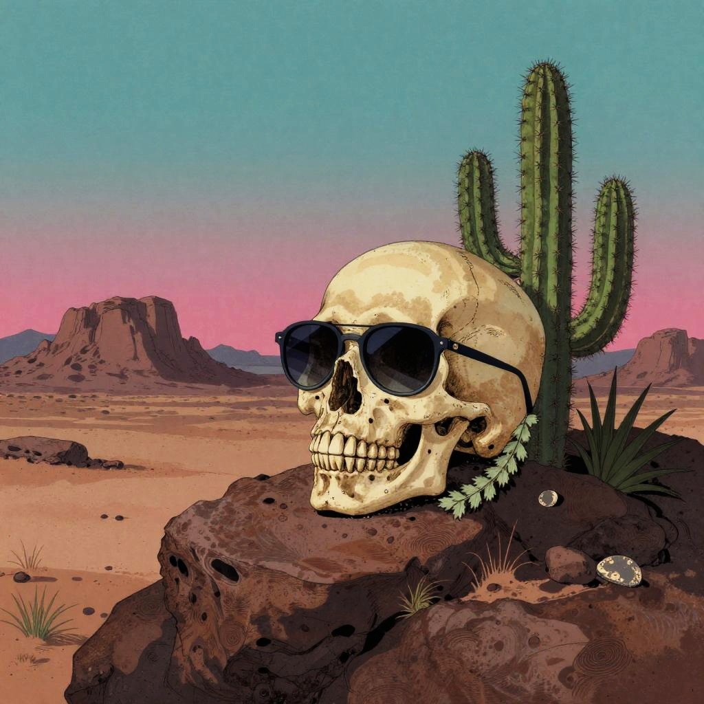 A skull wearing sunglasses with a cactus lei in a rocky mesa desert, illustrated in Ukiyo-e style, bright teal and warm magenta twilight skies, desert landscape, high detail, fantasy art with moody atmospheric lighting, minimalistic yet vibrant colors