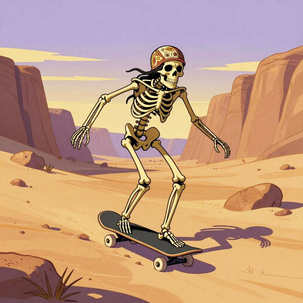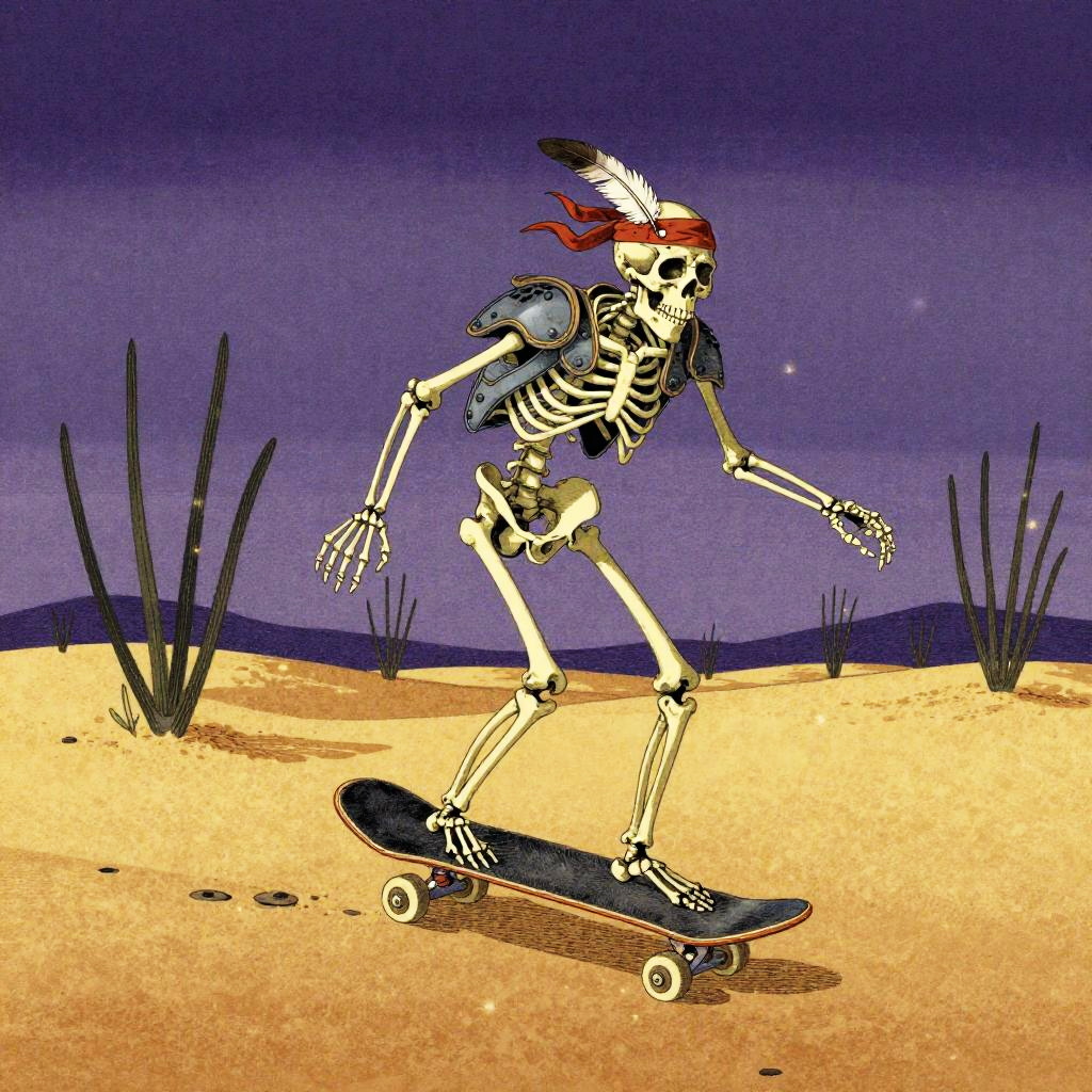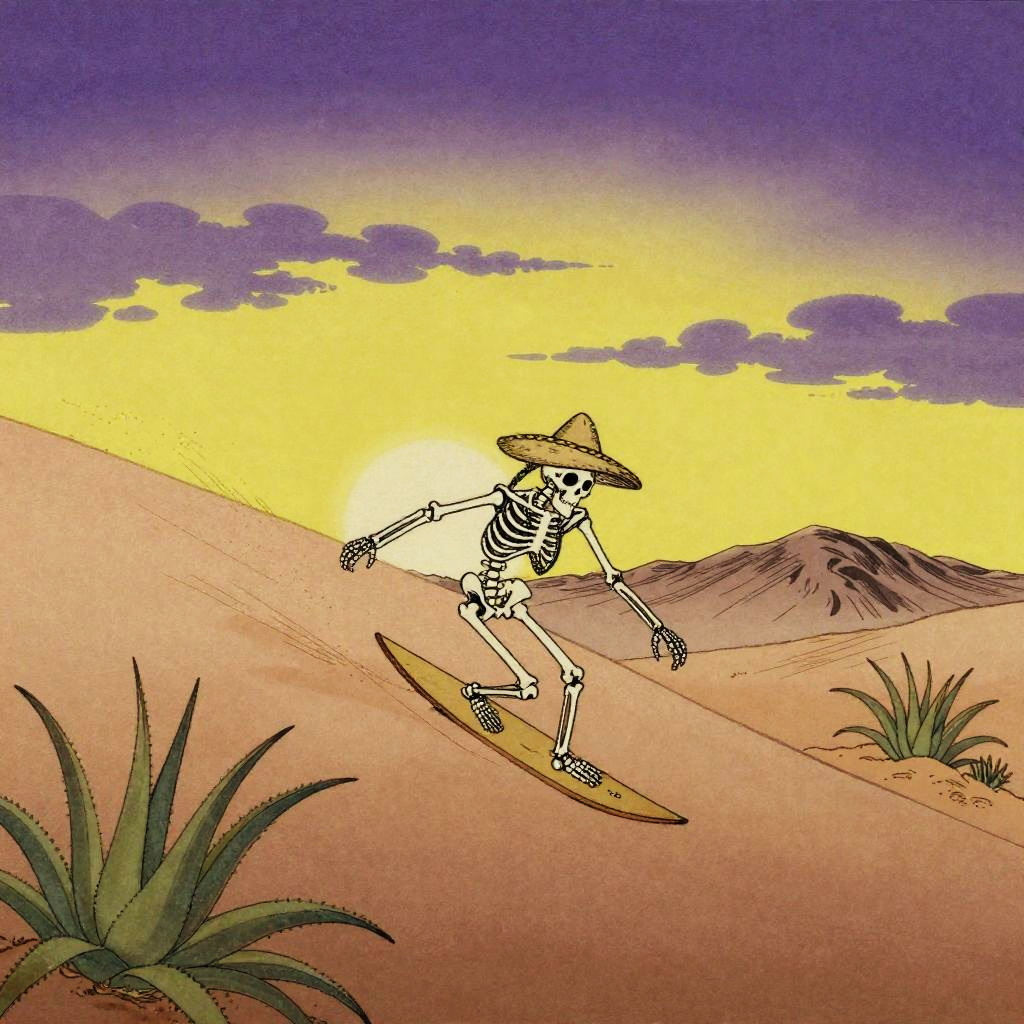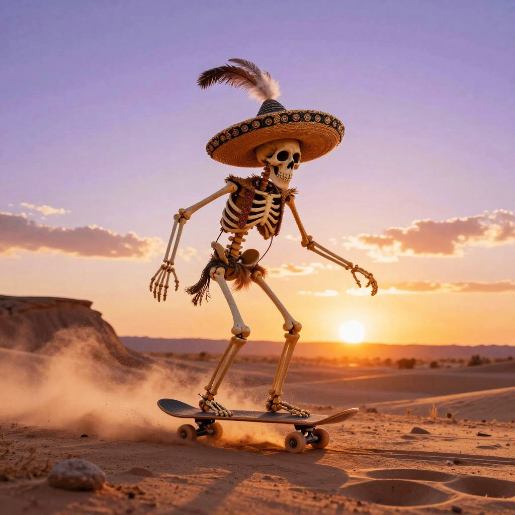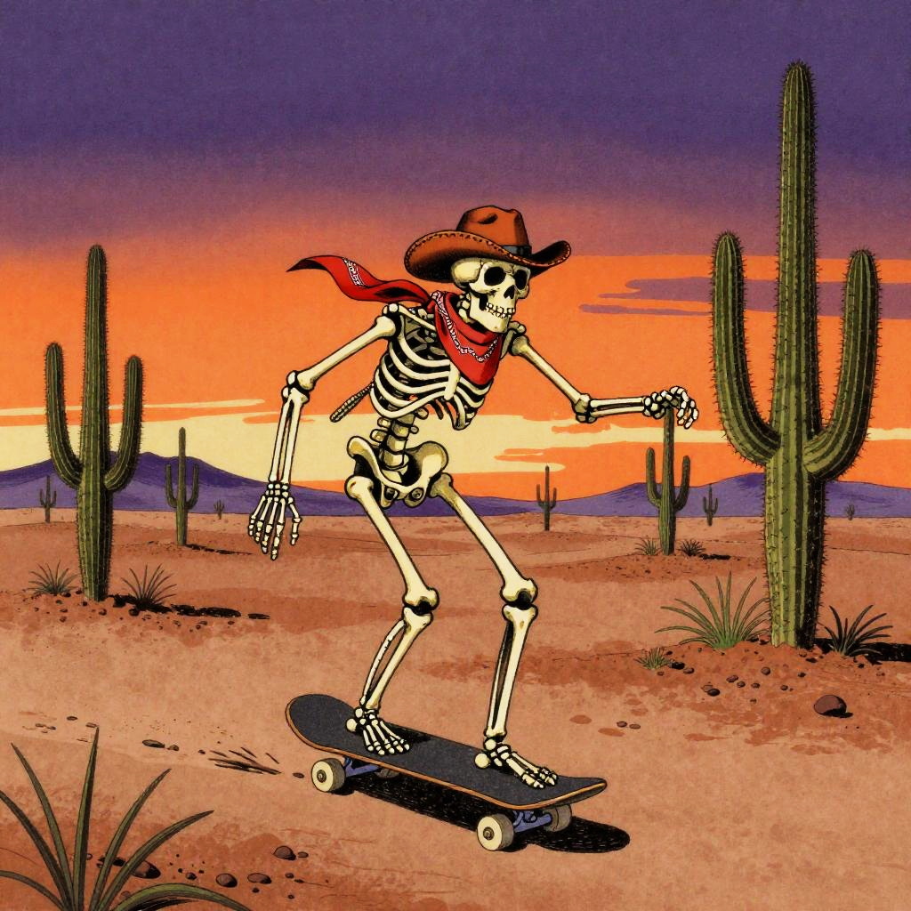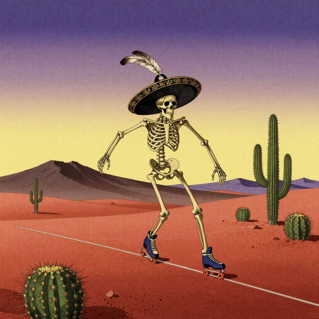 A skull wearing sunglasses with a cactus lei in a rocky mesa desert, illustrated in Ukiyo-e style, bright teal and warm magenta twilight skies, desert landscape, high detail, fantasy art with moody atmospheric lighting, minimalistic yet vibrant colors