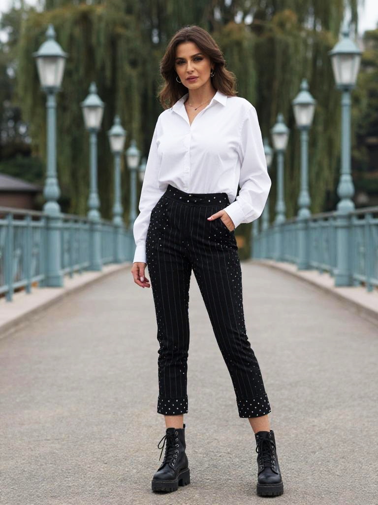 A Willowy woman, in a cinecolor style, wearing a relaxed white button-up shirt and black high-waisted pants with vertical stripes and polka dots, cropped at the ankle, and chunky black lace-up boots, poses with one hand in her pocket on a historic bridge adorned with lanterns. Sexy. Pretty face and beаutiful eyes. Big breasts