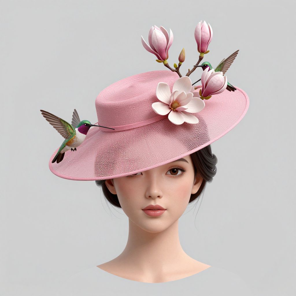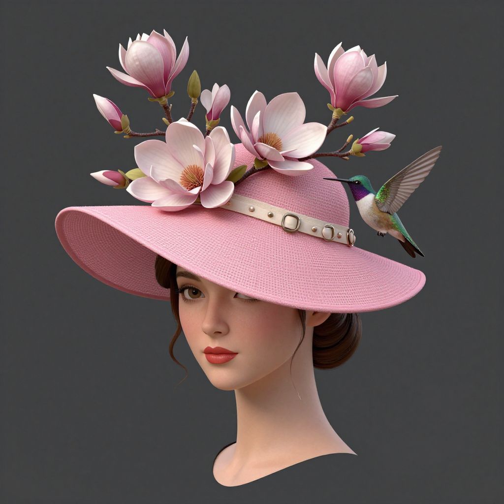 A computer-generated, high-definition illustration of a woman wearing a stylish pink fascinator hat adorned with intricate magnolia flowers and hummingbird accents, showcasing a blend of elegance and natural beauty in a digital art medium.