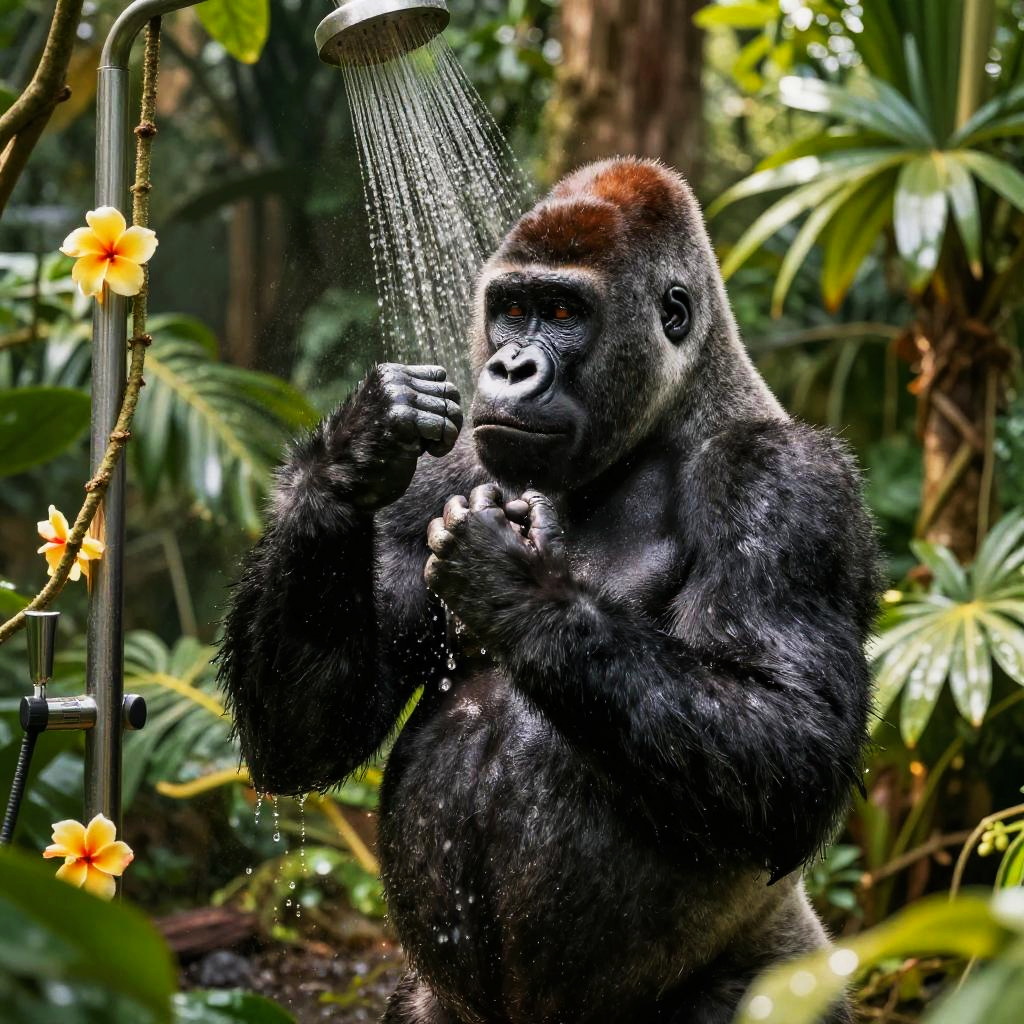 Majestic gorilla showering in a tropical jungle shower set with vines and flowers, droplets sparkling in sunlight, photorealistic style with vivid detail