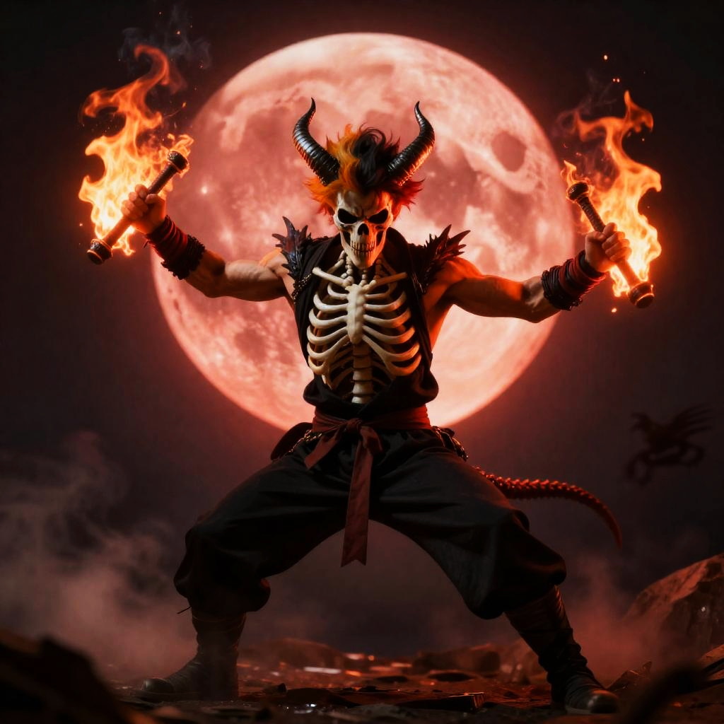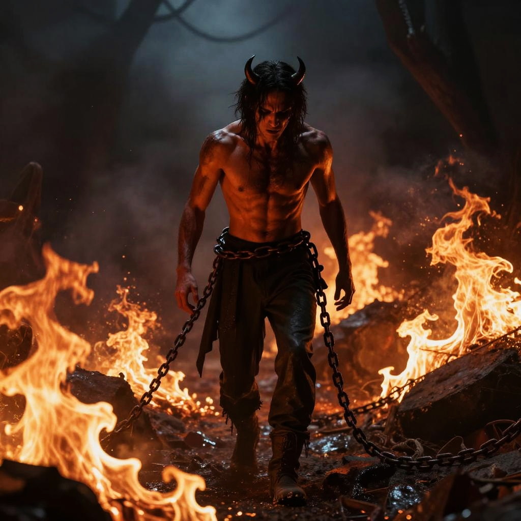 Realistic photo.a tormented male demon wandering through a fiery abyss, with chains dragging behind him, featuring flickering flames casting haunting shadows, dark and emotive concept art realistic photo