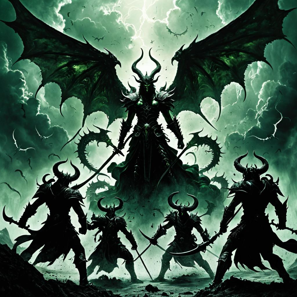 A dark fantasy scene featuring a group of armored demon warriors with large bat-like wings and horned helmets standing on cracked earth. The figures hold menacing weapons such as tridents and spears, surrounded by a green venomous aura and ominous, stormy clouds. The image conveys a sinister atmosphere with heavy shadows and distorted proportions, inspired by Luis Royo's style.
