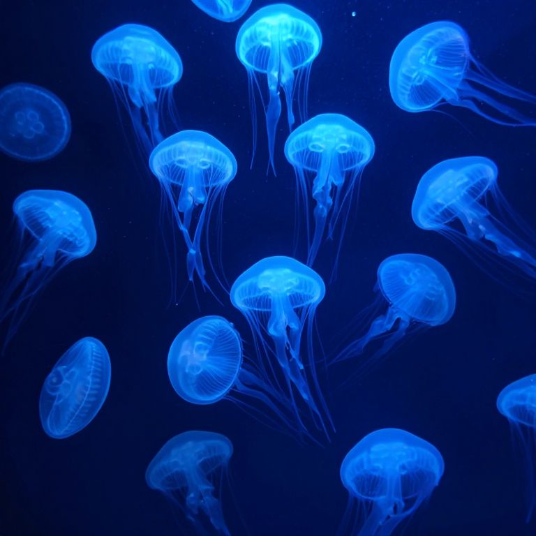 Photograph of a vibrant underwater scene featuring a group of glowing blue jellyfish, floating gracefully against a deep blue background. The jellyfish have translucent, dome-shaped bodies with intricate, glowing patterns and long, flowing tentacles. They are arranged randomly, creating a sense of movement and depth. The bright blue light from the jellyfish contrasts strikingly with the dark blue background, highlighting their ethereal, bioluminescent quality. The image captures the delicate and mesmerizing beauty of these marine creatures in a naturalistic, underwater environment.