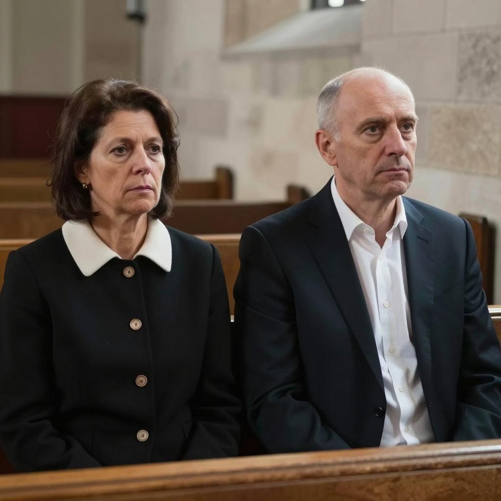A photograph of a middle-aged man and woman sitting side by side in a church. The woman has short dark hair, light skin, and wears a black jacket with a white collar. The man has balding light gray hair, light skin, and wears a dark suit with a white shirt. Both look forward with serious expressions. The background includes stone walls and wooden pews.
