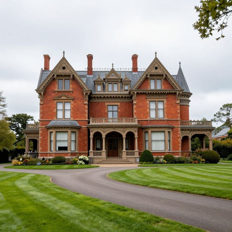 Photograph of a grand, Victorian-style red brick mansion with intricate stone detailing and gabled roof. The house features three prominent chimneys, a central arched entrance with a wooden balustrade, and large, symmetrically placed windows. A winding, paved driveway leads to the front steps, bordered by a well-manicured, green lawn with trimmed hedges and blooming flowers on either side. The sky above is overcast, casting a soft light on the scene. Trees frame the background, adding a touch of natural elegance to the stately architecture.
